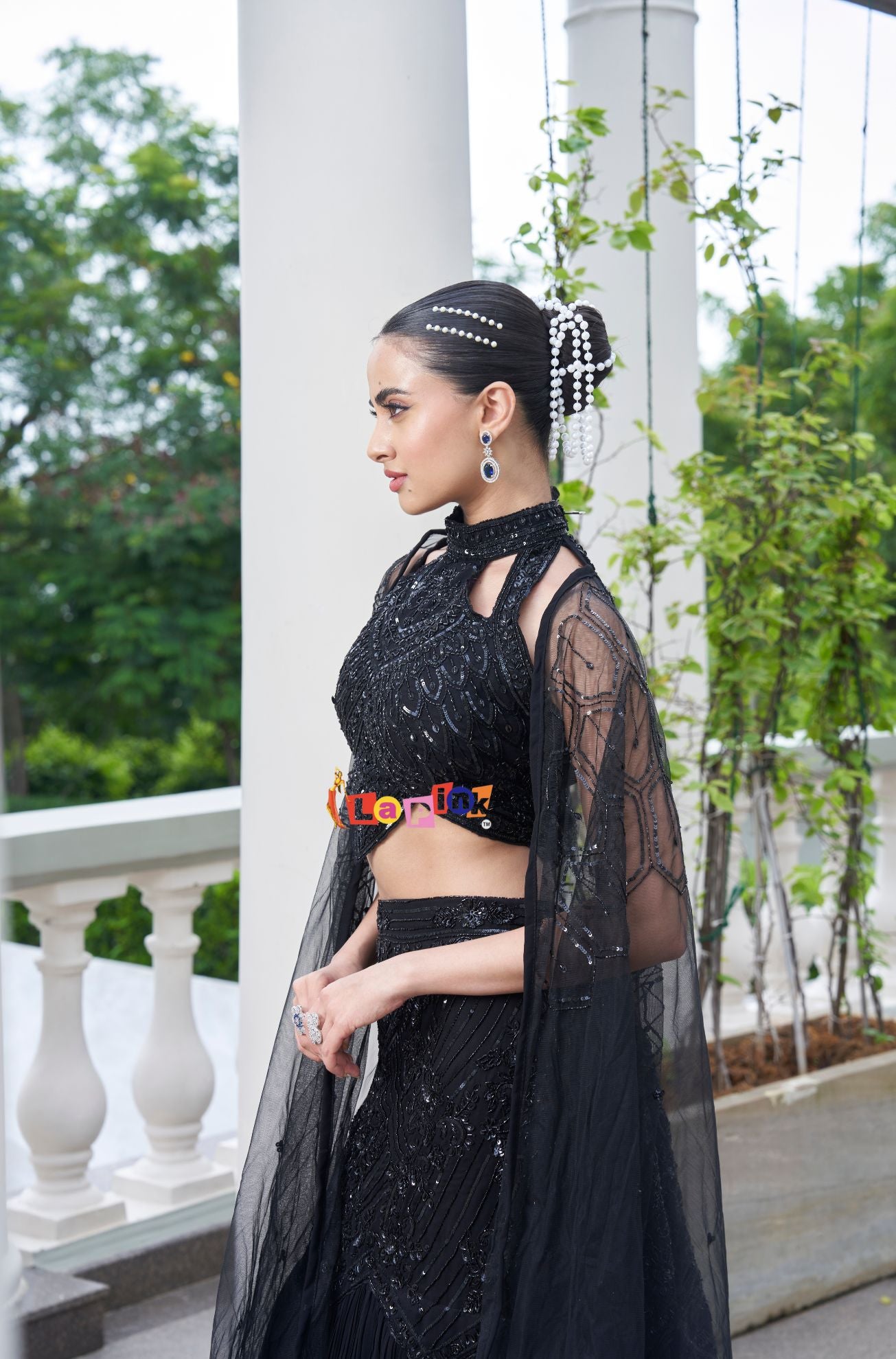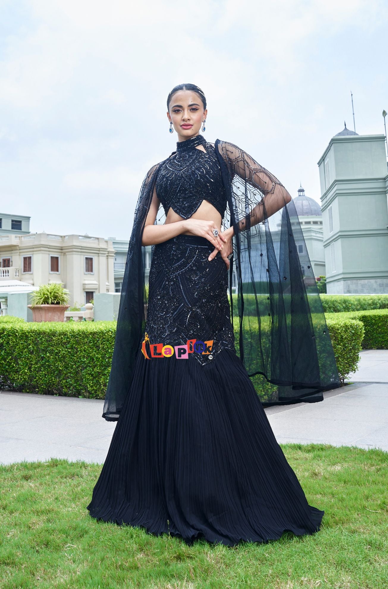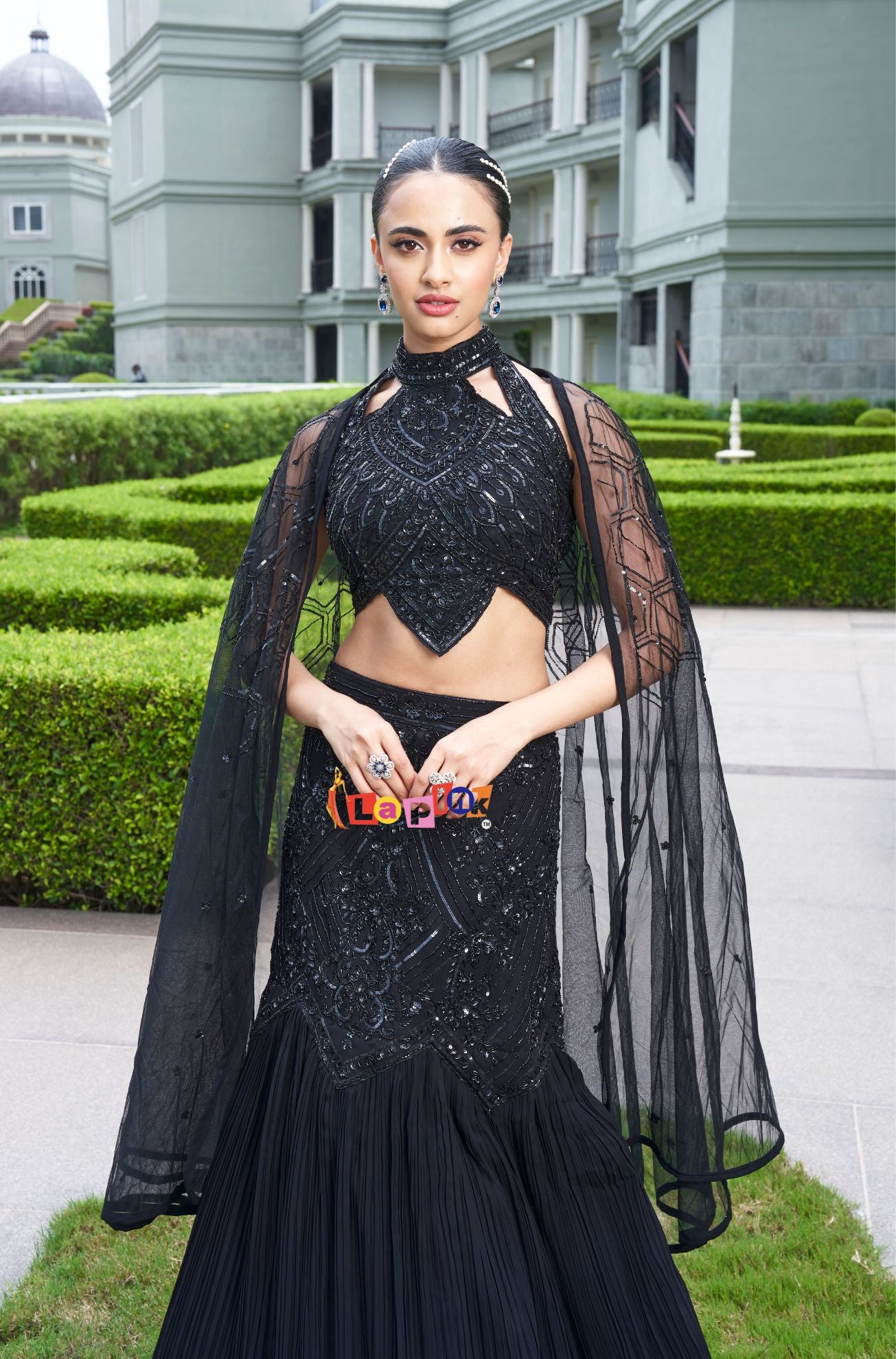 This lehenga set is designed on viscose fabric and features detailed hand work with multi moti and sequence work. The crop top is styled to pair seamlessly with the fish cut lehenga, creating a well-structured and balanced look. The embroidery and finishing details make it a fitting choice for occasions that call for a refined and traditional outfit.