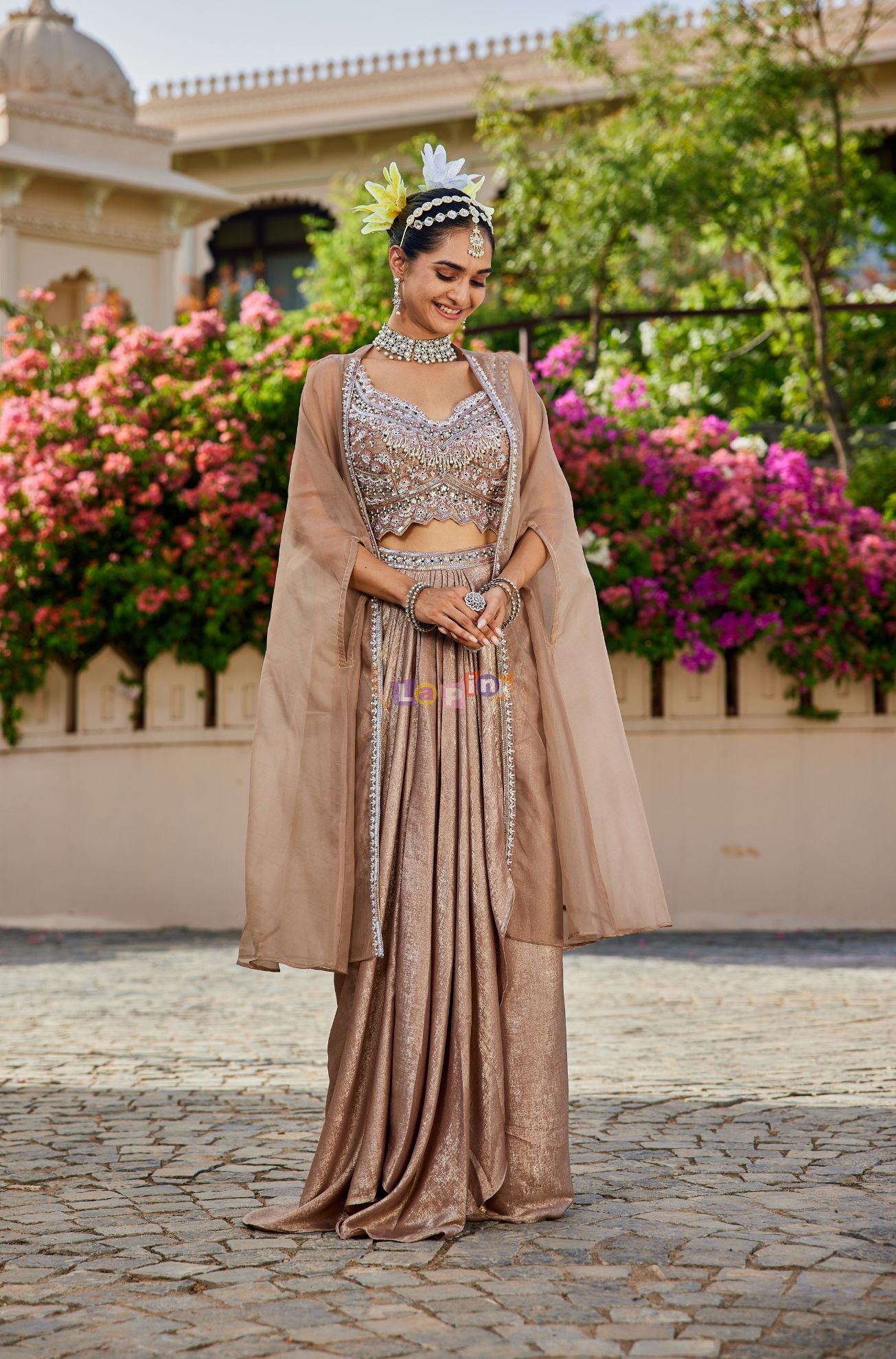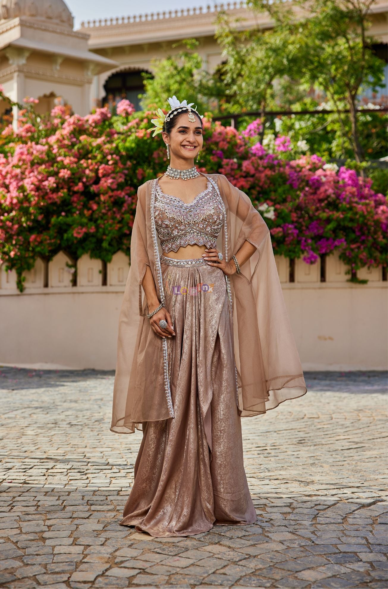 This mouse grey three-piece set offers a refined combination of style and comfort. The lycra skirt ensures a flattering fit, while the organza cape adds a layered look to the outfit. Detailed handwork with moti and sequence on the net fabric enhances the design, making it a suitable choice for festive occasions and celebrations.