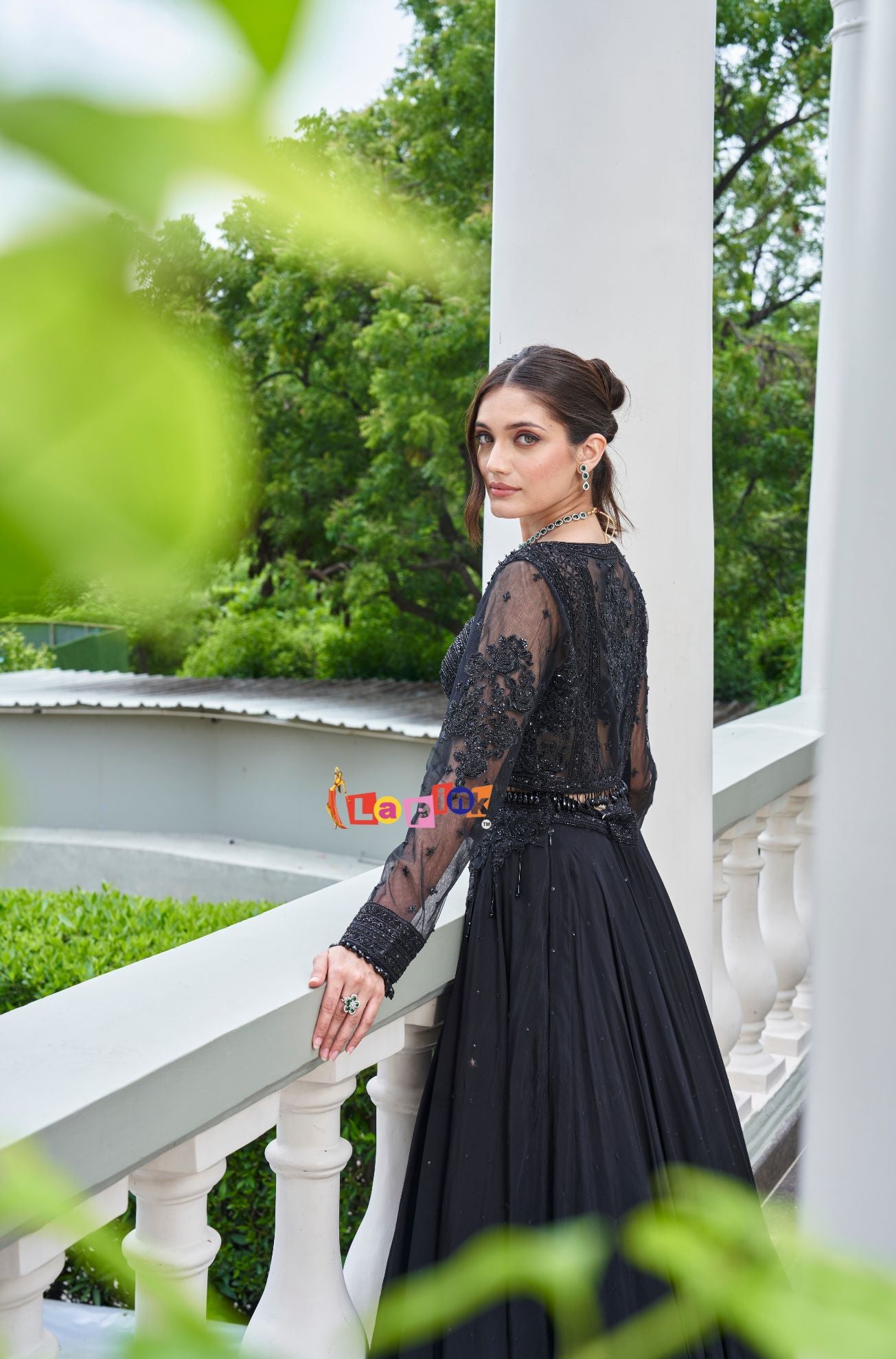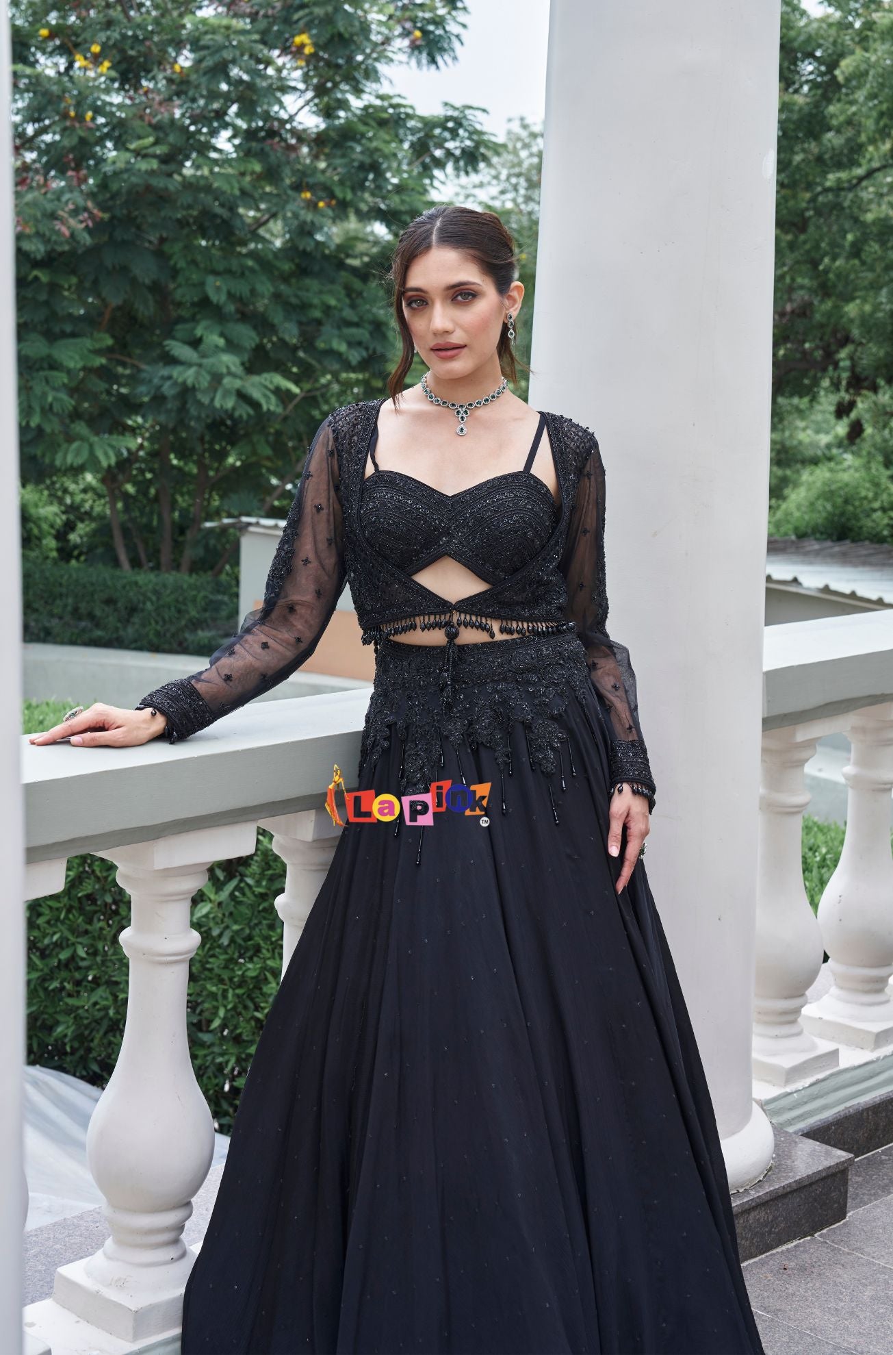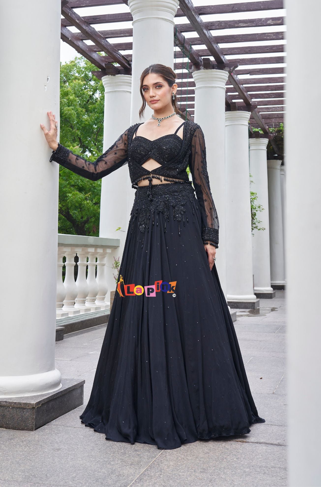 This lehenga set is made from soft viscose fabric and features detailed handwork with sequins and piping that adds fine finishing to the outfit. The set is paired with a full-sleeve jacket, giving it a structured appearance while adding extra coverage and style. The deep black color makes it a versatile option that can be worn for various festive and formal occasions. Designed to balance comfort and style, this outfit is a suitable choice for those looking for a classic yet detailed ensemble.