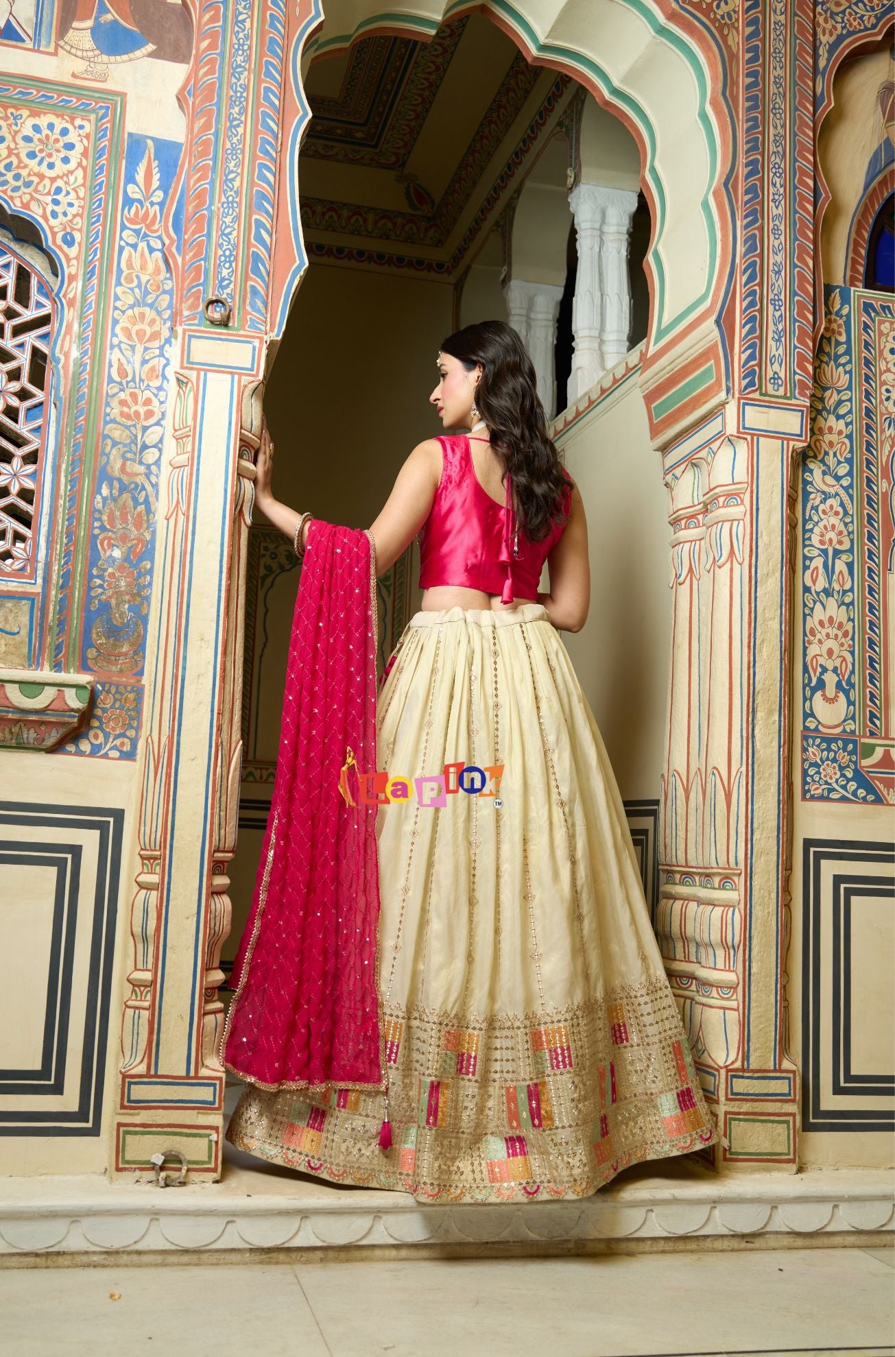 This lehenga set features detailed multi embroidery with moti and stone work on soft shimar fabric. It is paired with a matching viscose dupatta, creating a coordinated and refined look. The design offers a blend of traditional craftsmanship and comfortable wear, making it a practical choice for special occasions.