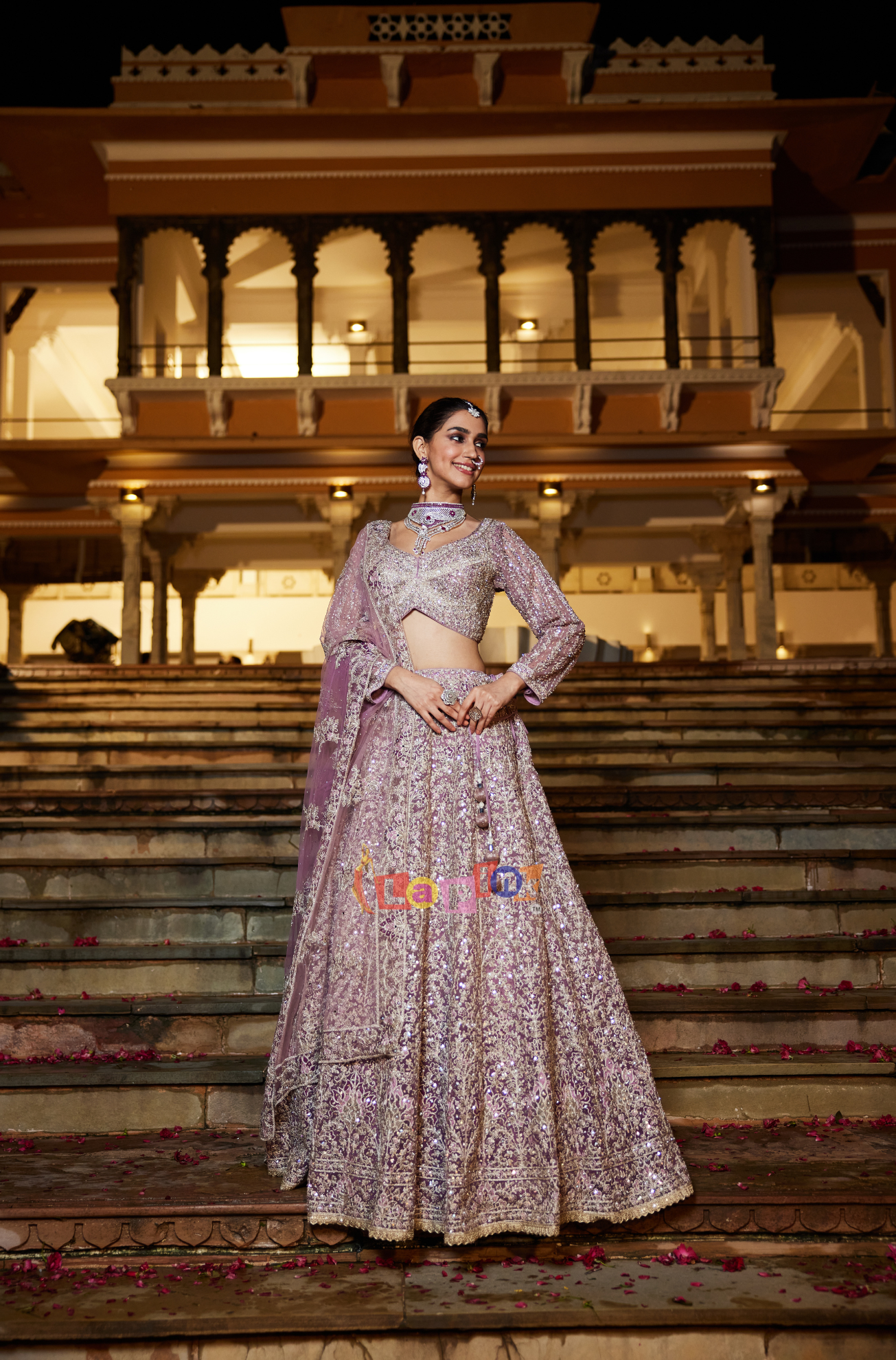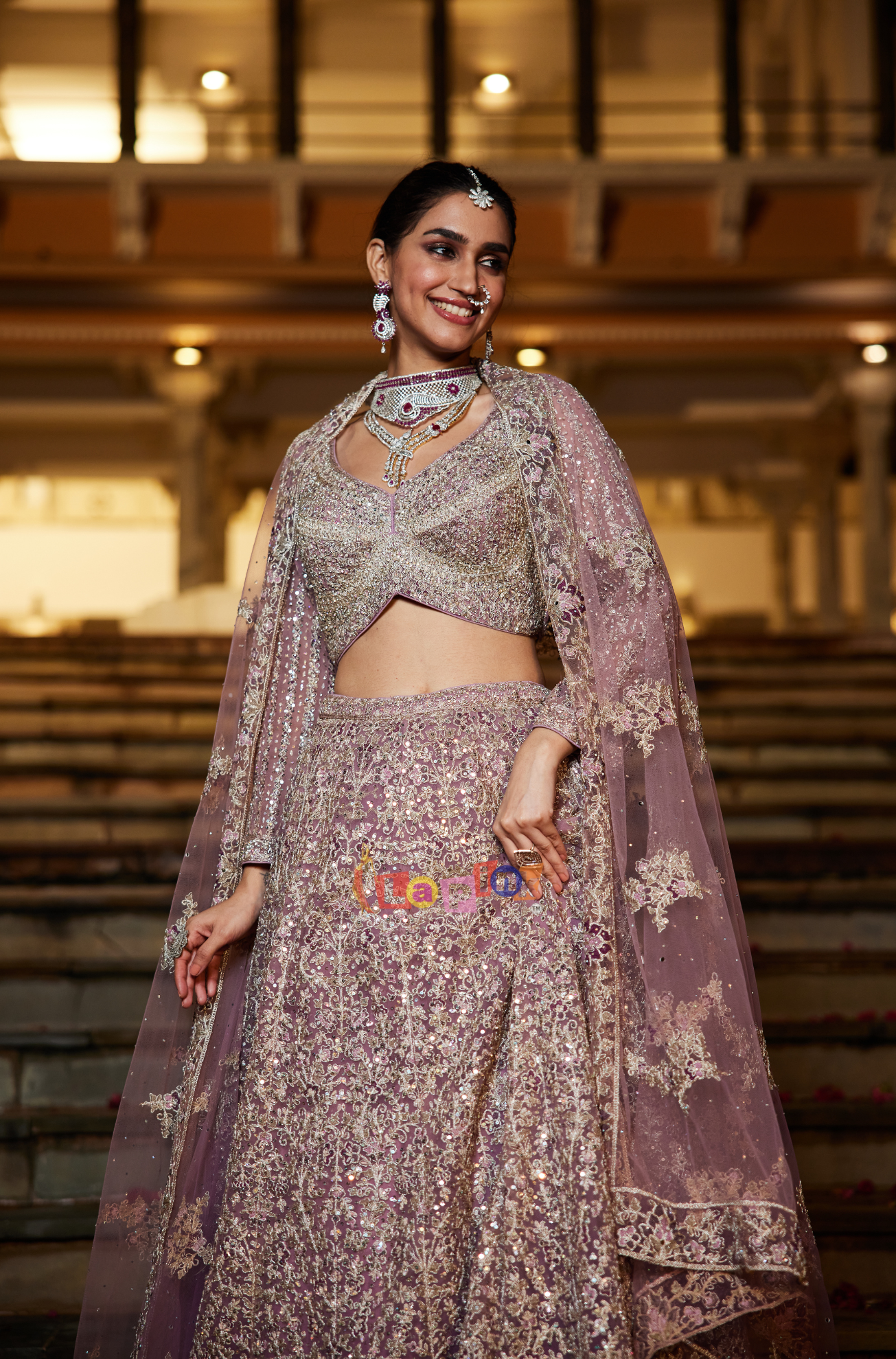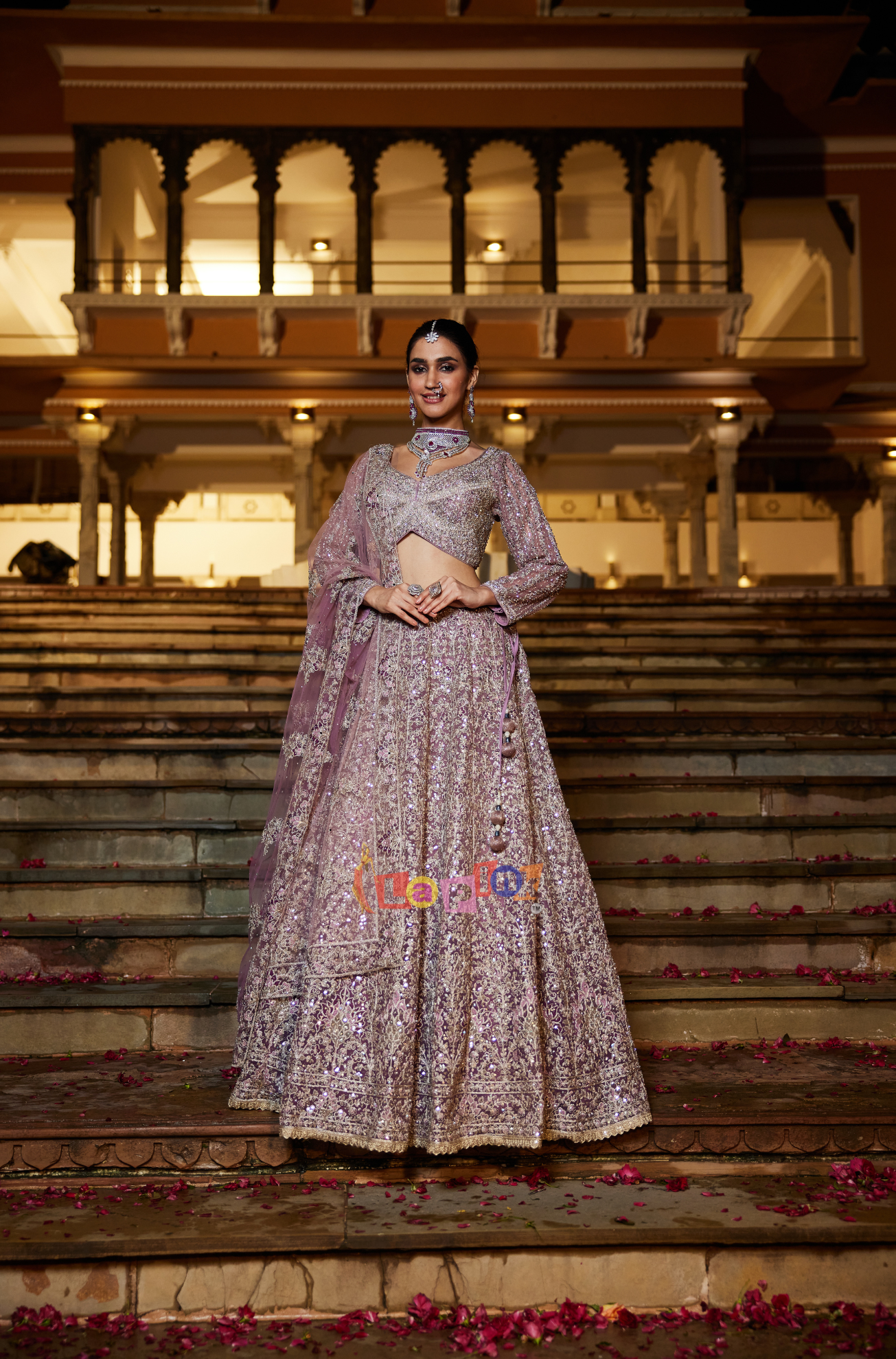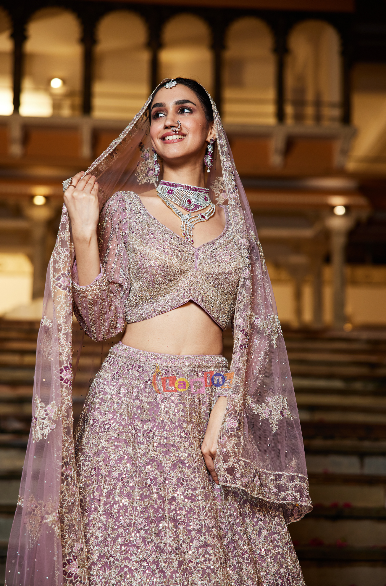 The lehenga features all-over multi-embroidery with mirrors and stonework, creating a refined and eye-catching look. The full-sleeve blouse enhances the ensemble's overall sophistication, while the matching net dupatta adds a graceful finish. The onion-shaded color palette lends a contemporary yet versatile appeal, making it suitable for weddings, festive gatherings, and evening celebrations.