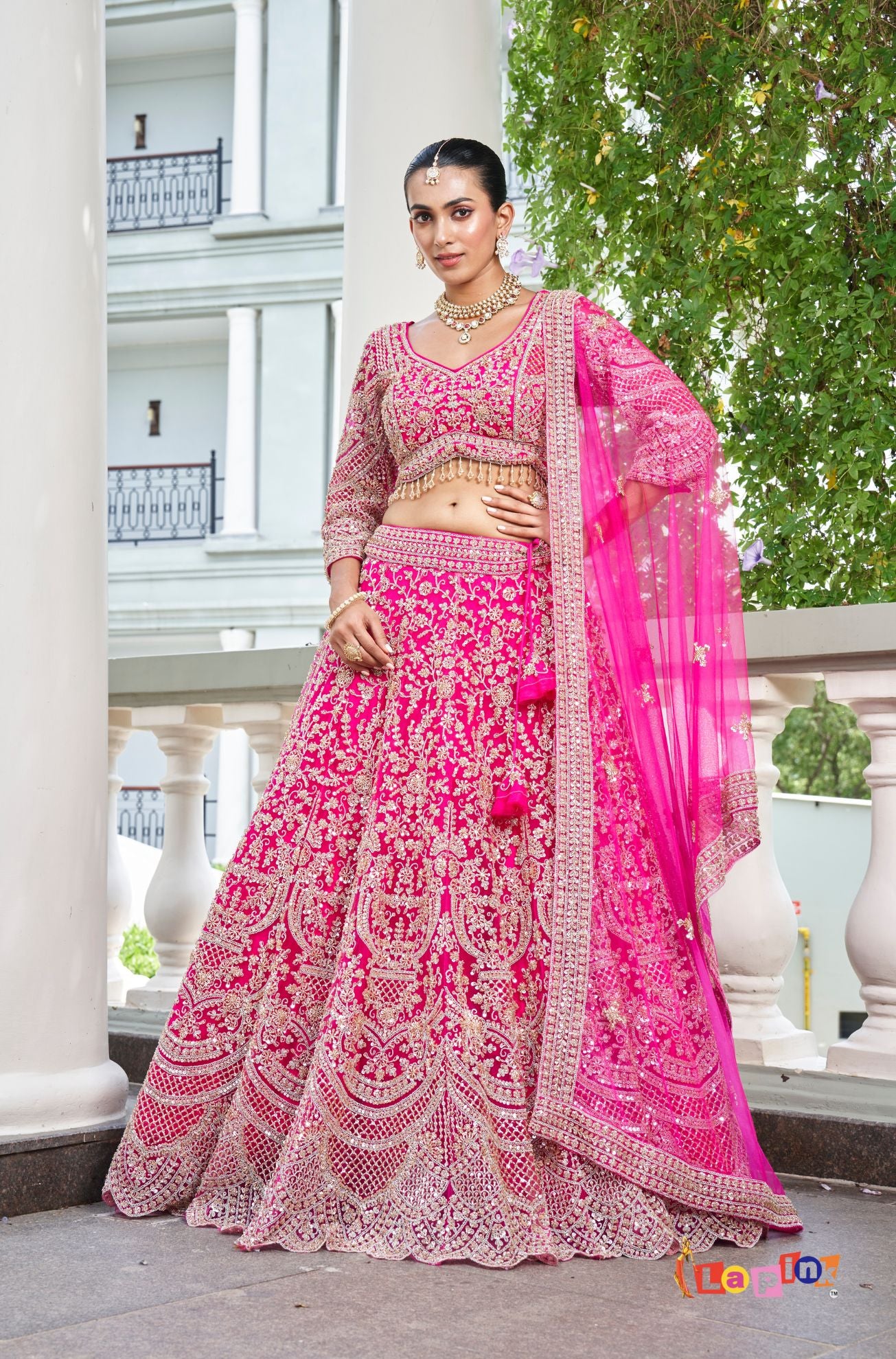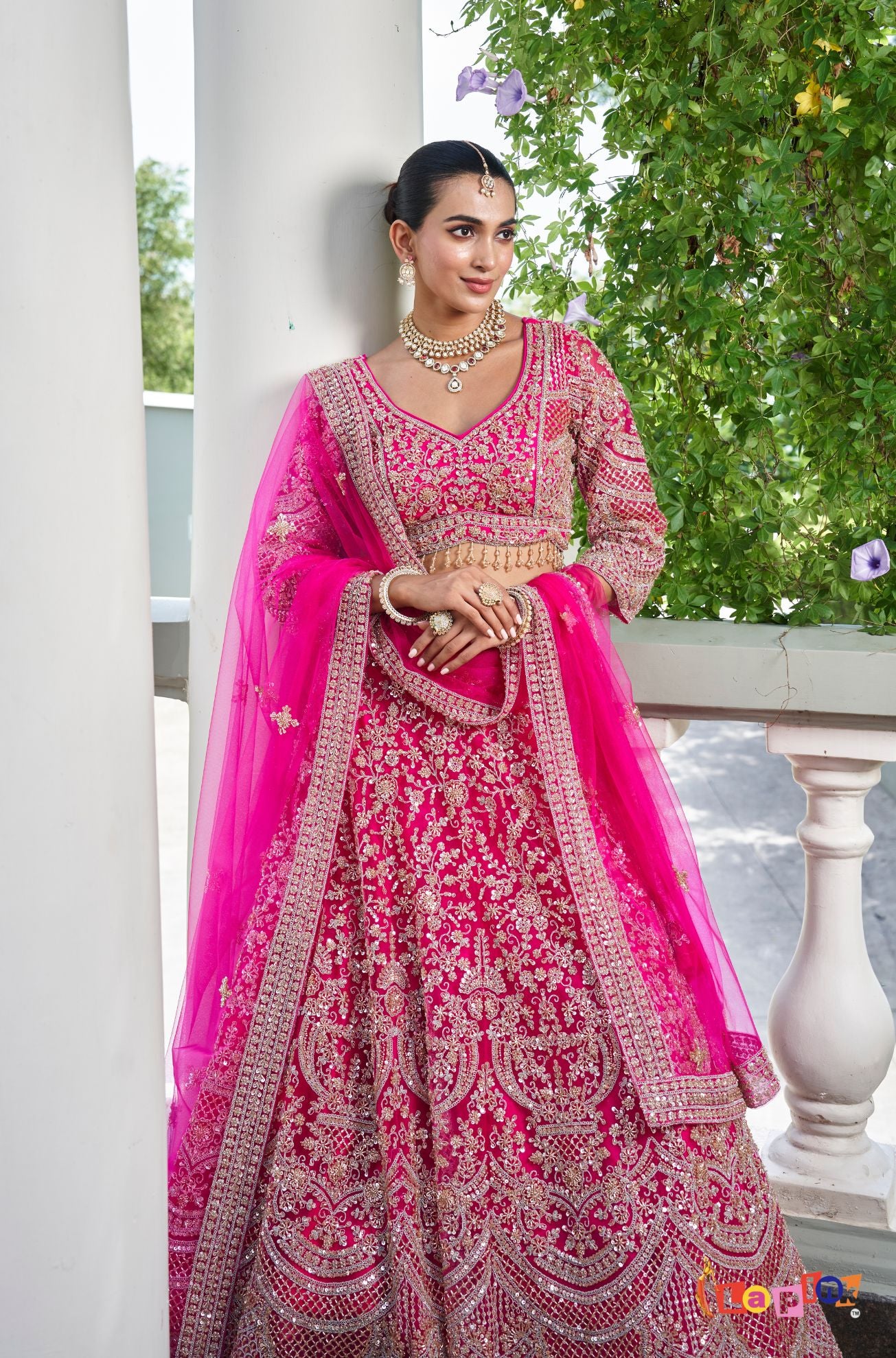 This lehenga set is crafted on net fabric and features detailed all over bits work, adding depth to the overall design. The lehenga is paired with a blouse and complemented by a dupatta finished with a four-side border that gives a neat and balanced look. The rani color adds vibrance, making it an appropriate choice for wedding functions, festive gatherings, or special celebrations.