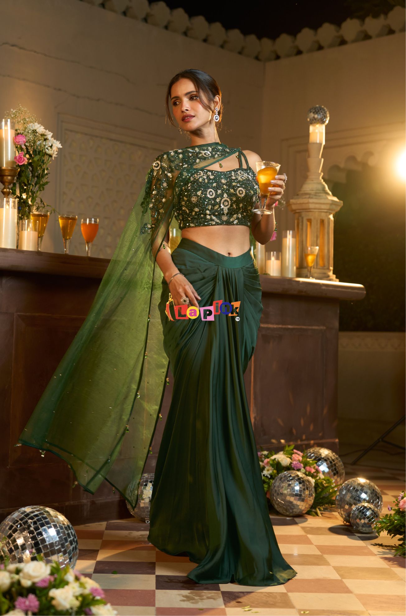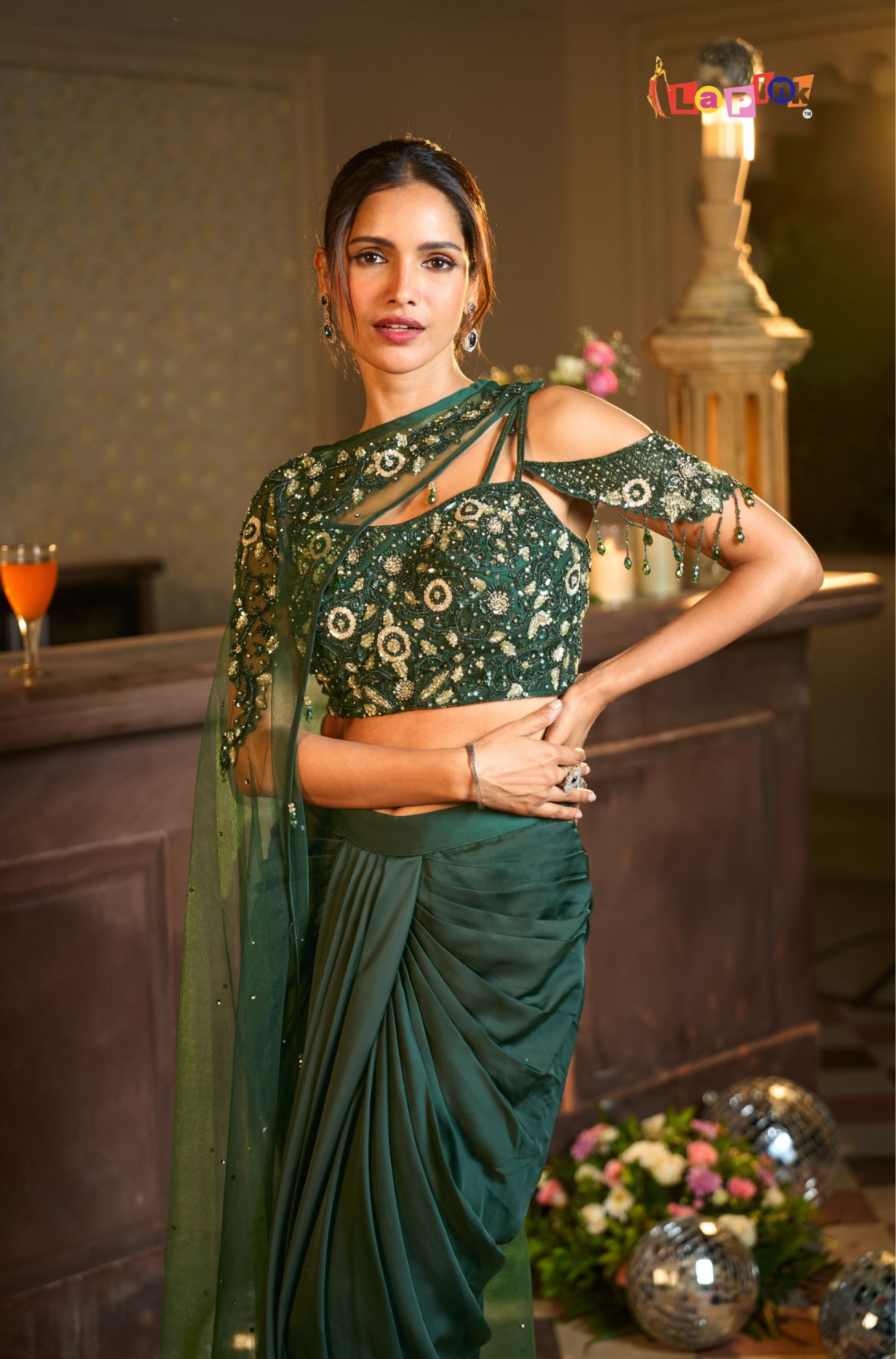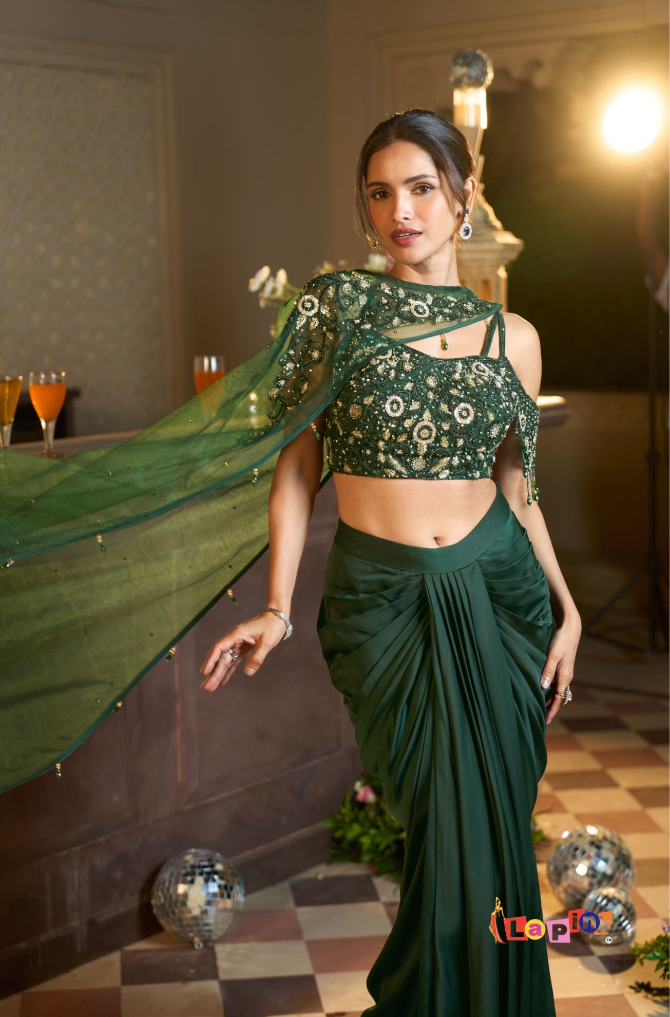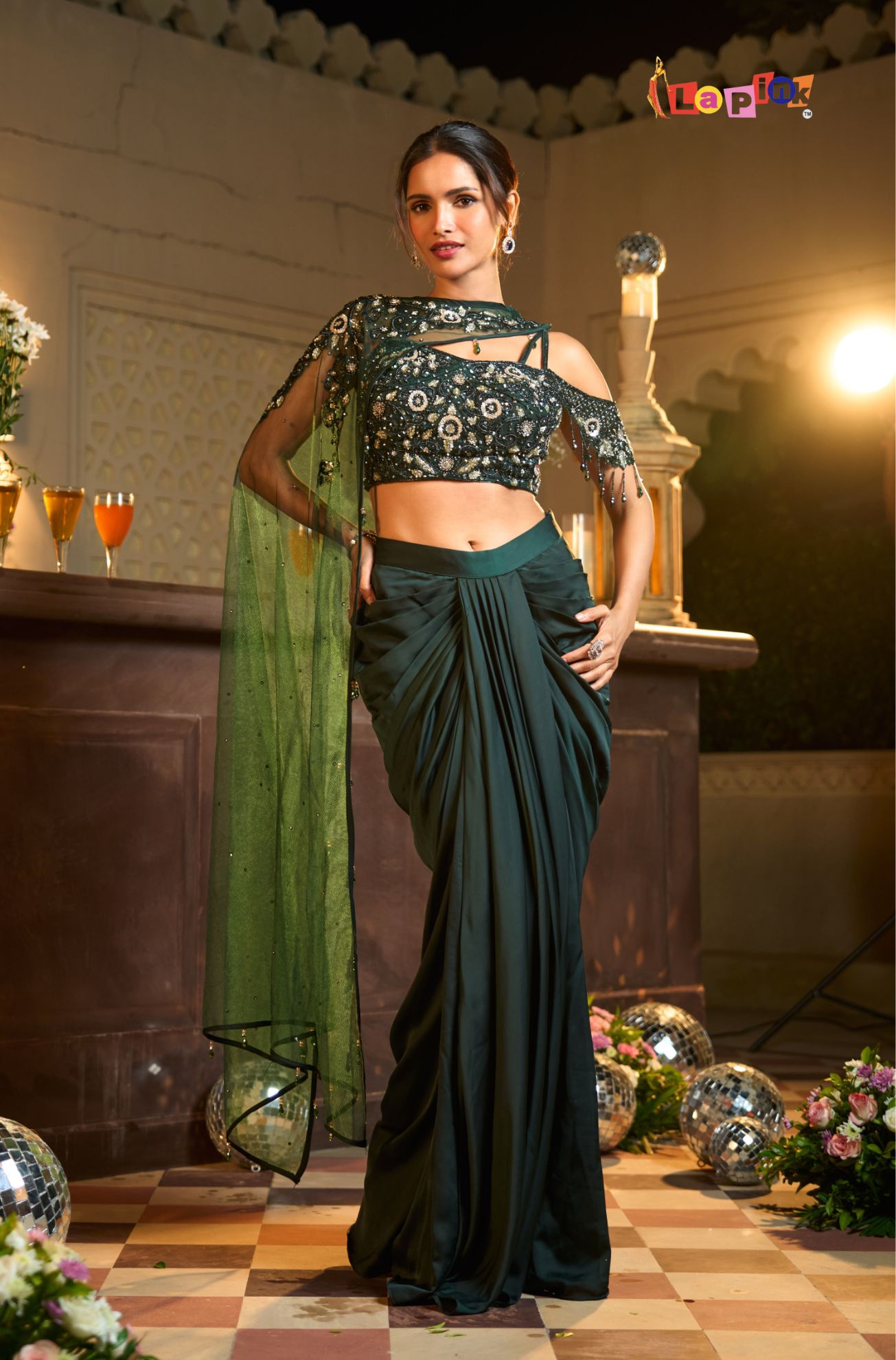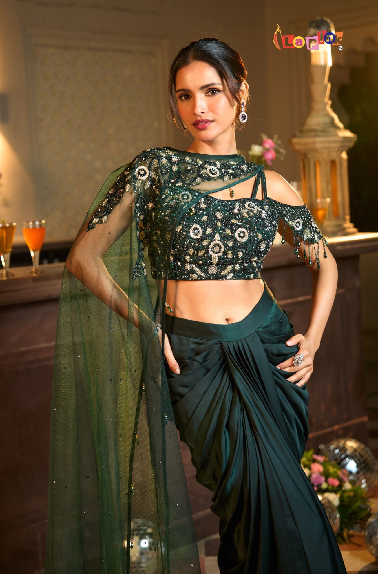 This designer set includes a net top paired with a coordinated drape skirt, detailed with handwork using multi-moti and sequence. The net fabric keeps the outfit light and comfortable, while the detailed surface work adds a neat and structured finish. The draped skirt enhances the overall flow of the outfit, making it suitable for festive gatherings and special occasions where a well-put-together look is preferred.