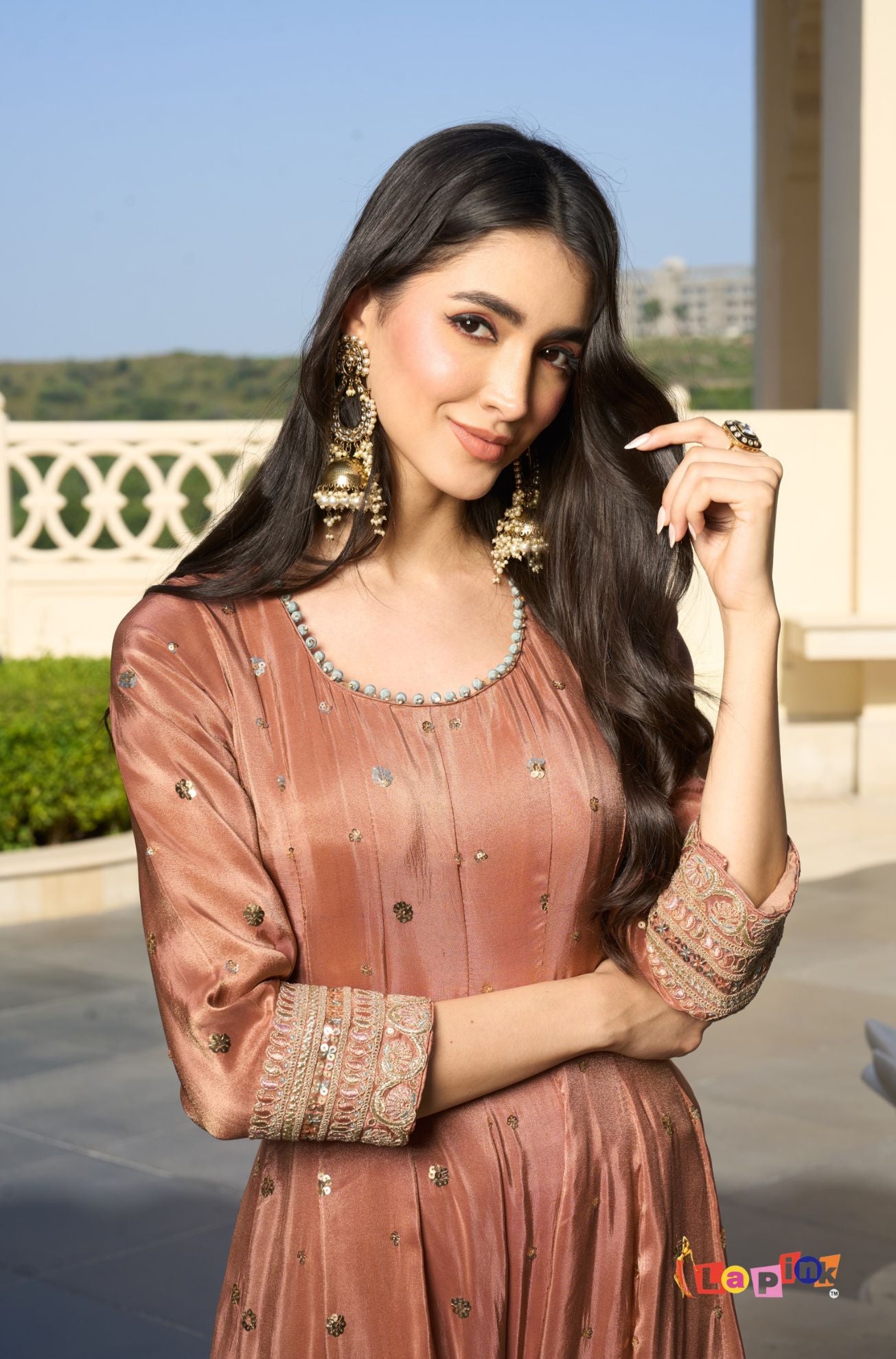 This outfit features multi-tone embroidery with sequence work on shimmer fabric, giving it a refined and structured appearance suitable for various traditional and semi-formal occasions. The short Anarkali top is designed with a clean and well-finished silhouette, paired with a comfortable pant that complements the overall style. The set is completed with a fancy dupatta that enhances the coordinated look, making it a practical choice for gatherings, festive events, and family functions. The detailing across the fabric adds depth without overwhelming the outfit, ensuring a balanced and graceful presentation.