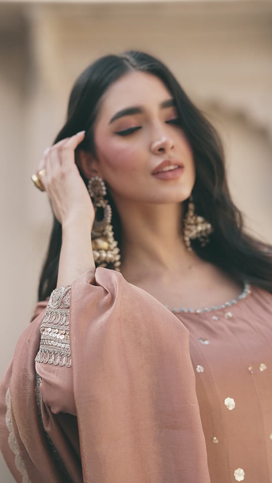 This outfit features multi-tone embroidery with sequence work on shimmer fabric, giving it a refined and structured appearance suitable for various traditional and semi-formal occasions. The short Anarkali top is designed with a clean and well-finished silhouette, paired with a comfortable pant that complements the overall style. The set is completed with a fancy dupatta that enhances the coordinated look, making it a practical choice for gatherings, festive events, and family functions. The detailing across the fabric adds depth without overwhelming the outfit, ensuring a balanced and graceful presentation.
