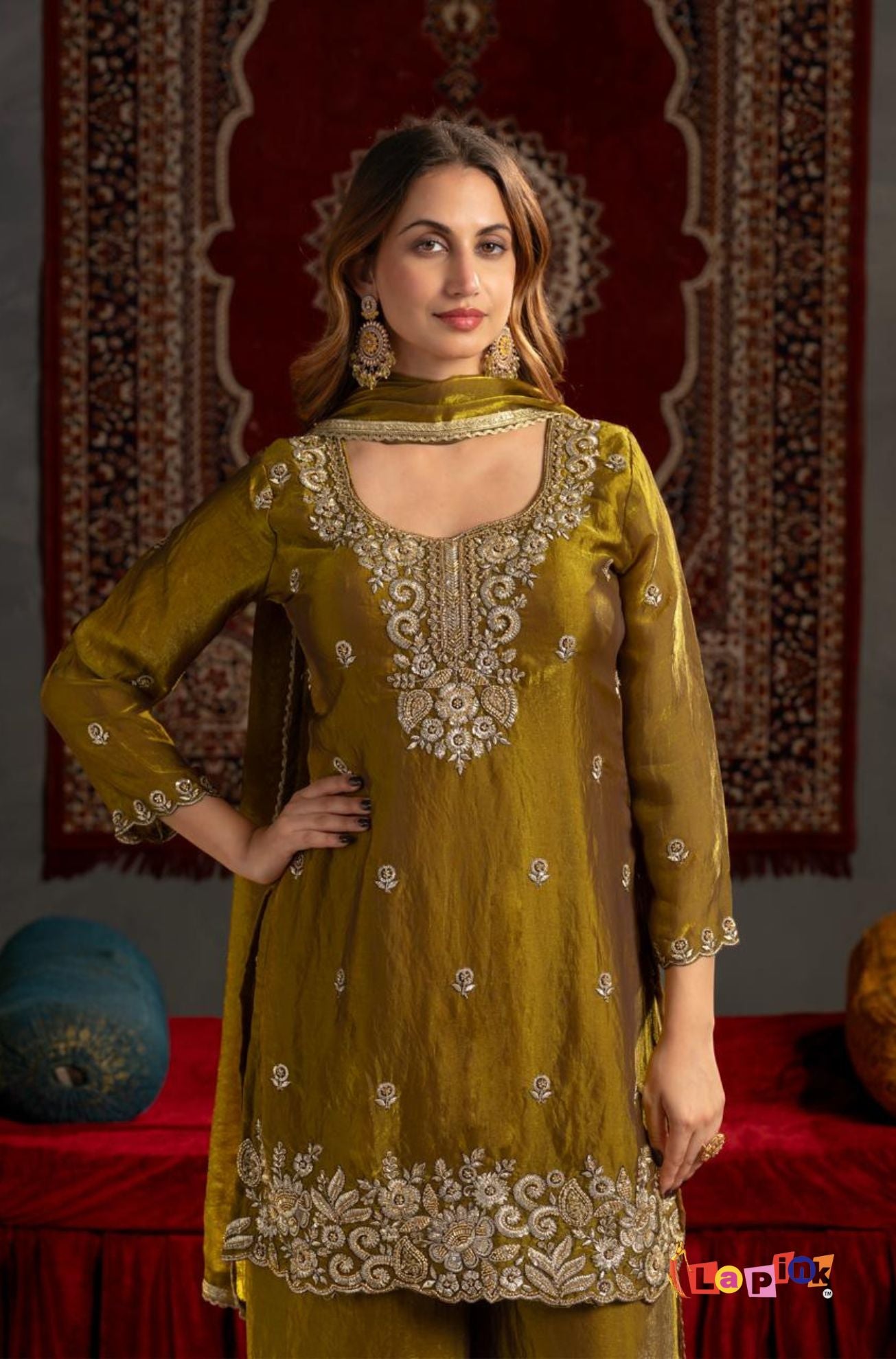 This three-piece sharara set comes with fine embroidery and clean piping work on Fendi fabric, giving it a neat and stylish look. The set includes a designer top paired with a comfortable sharara and a matching dupatta, making it suitable for festive events, family celebrations, and party occasions.