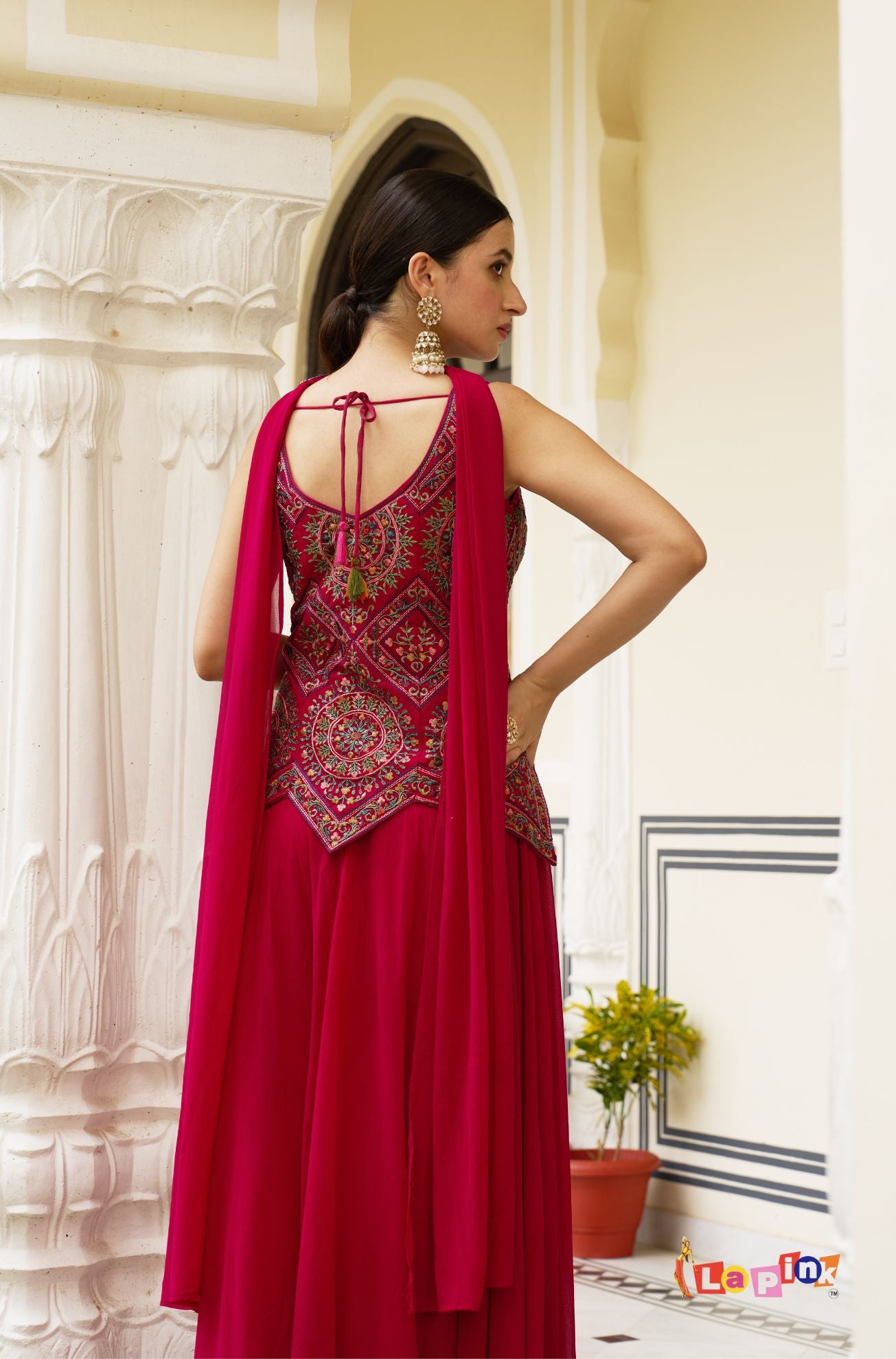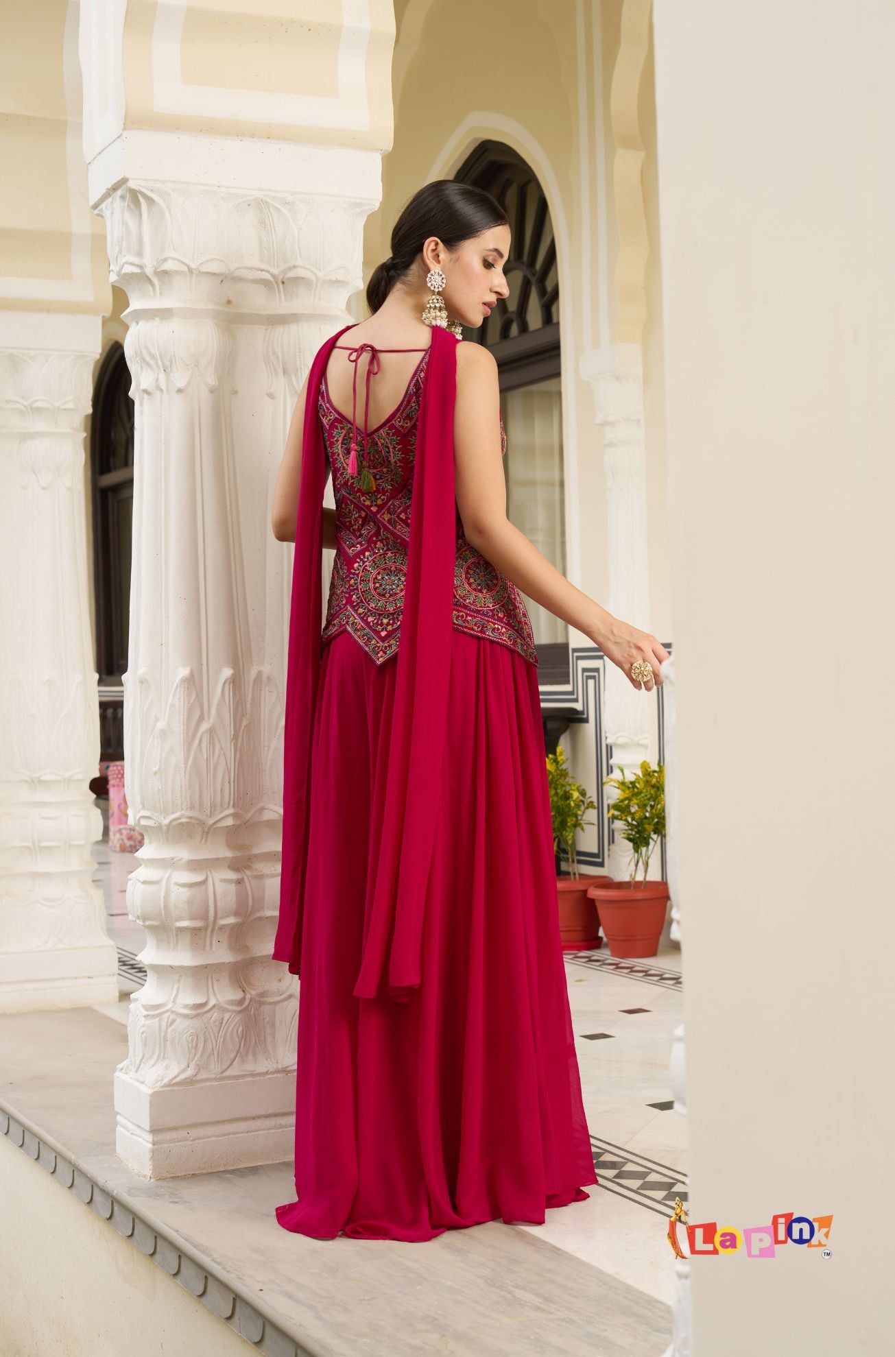 This outfit is crafted from viscose fabric and features multi-thread work combined with sequence detailing, giving the peplum top a structured and refined appearance. The set includes a comfortable divider bottom that complements the design and adds ease of movement, making it suitable for festive gatherings and family occasions. The matching neck dupatta completes the look with a simple yet coordinated finish.  functions.