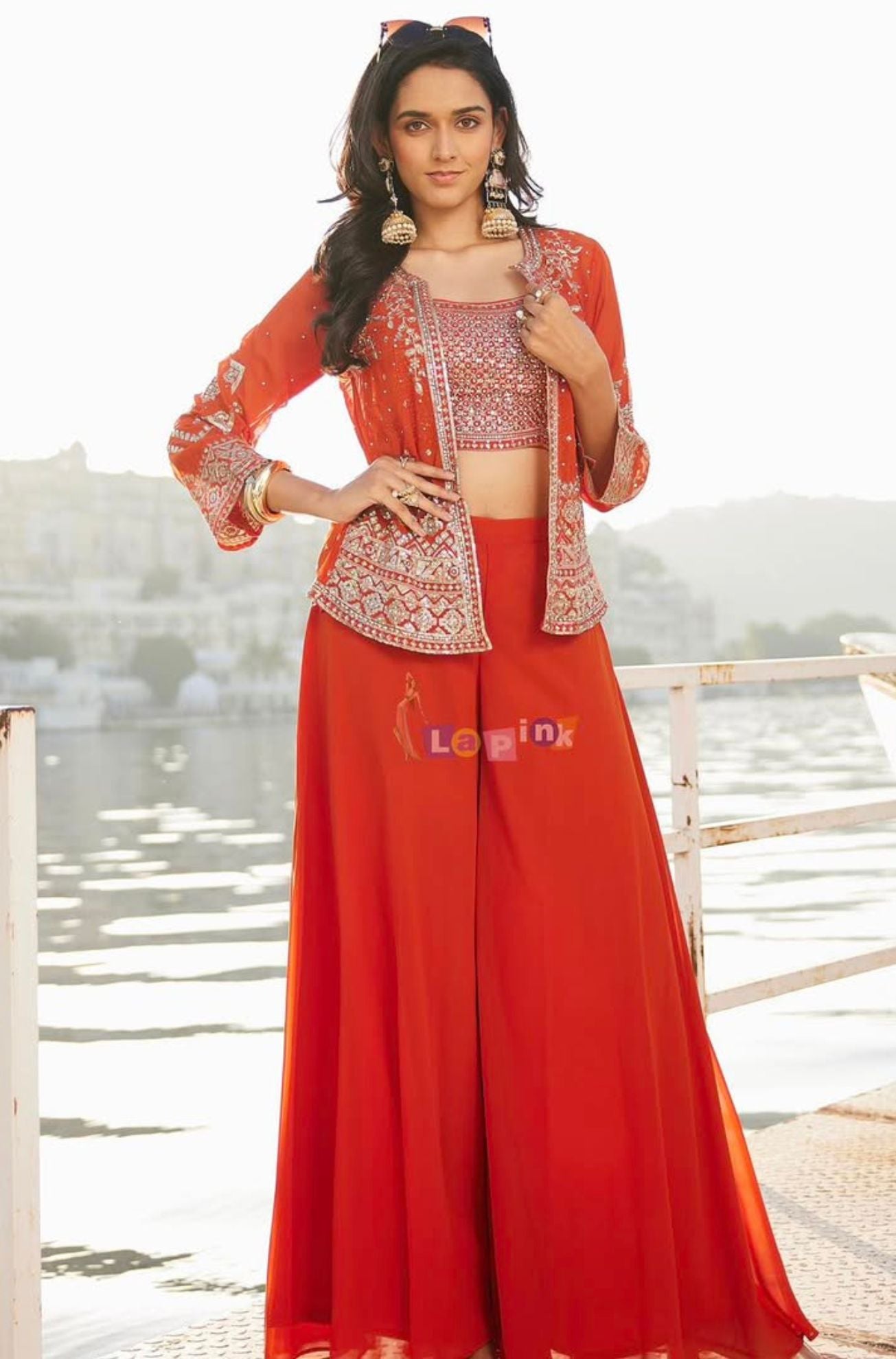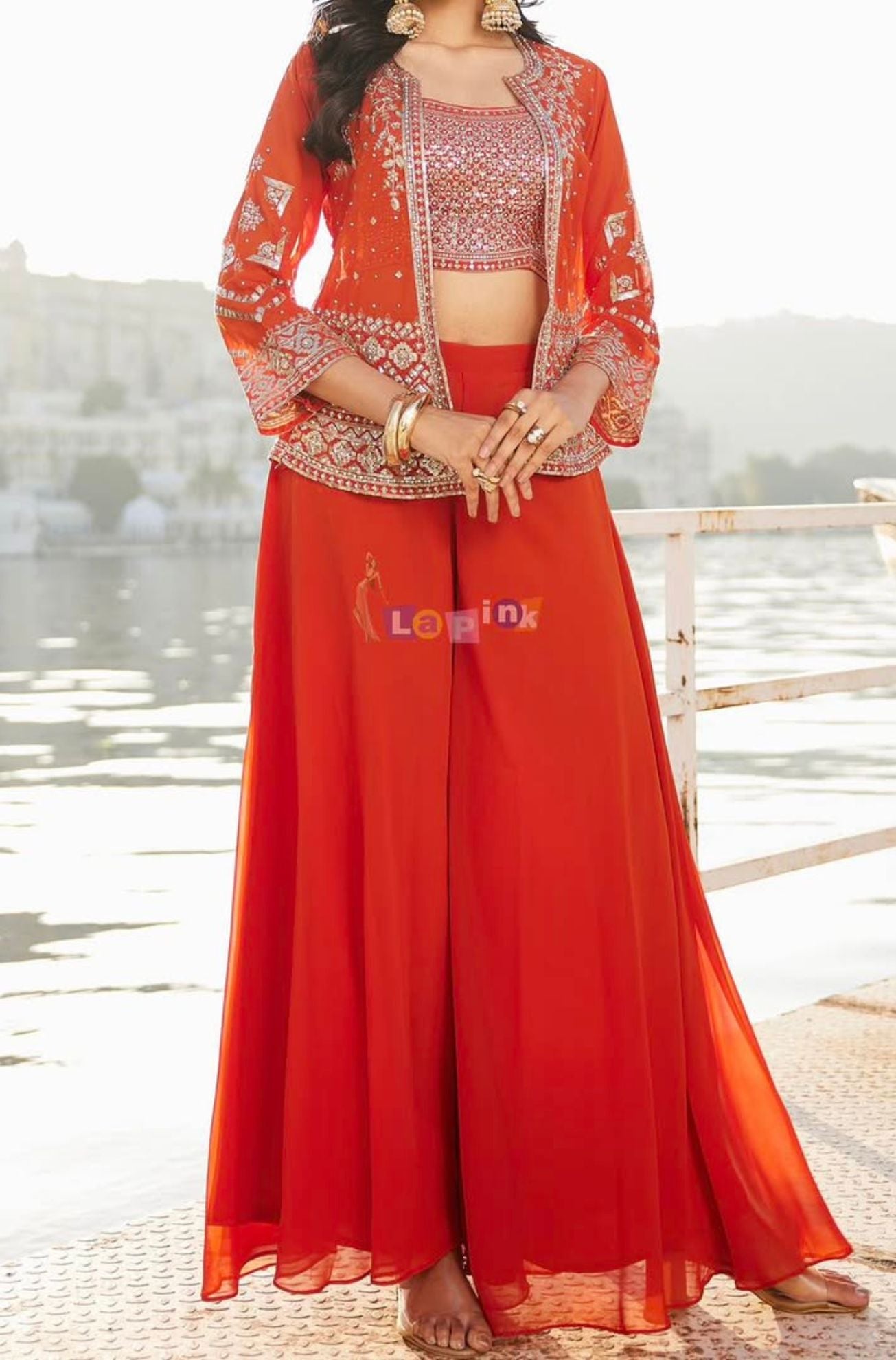 This three-piece fancy divider set is made from soft viscose fabric and features fine thread embroidery with sequins and stone work. The set includes a coordinated top and bottom, styled with a short jacket that adds a structured layer to the outfit. Available in three rich colour options, orange, wine, and firozi, this set is a versatile choice for festive events, casual celebrations, or family functions.