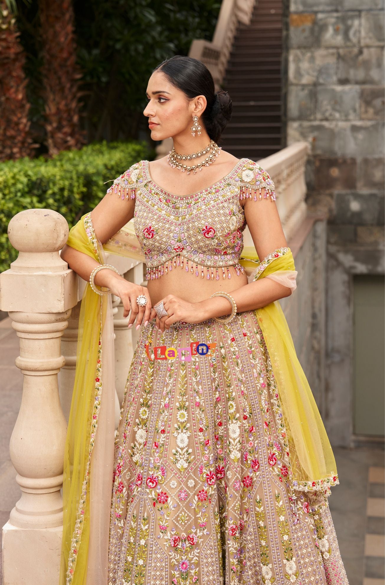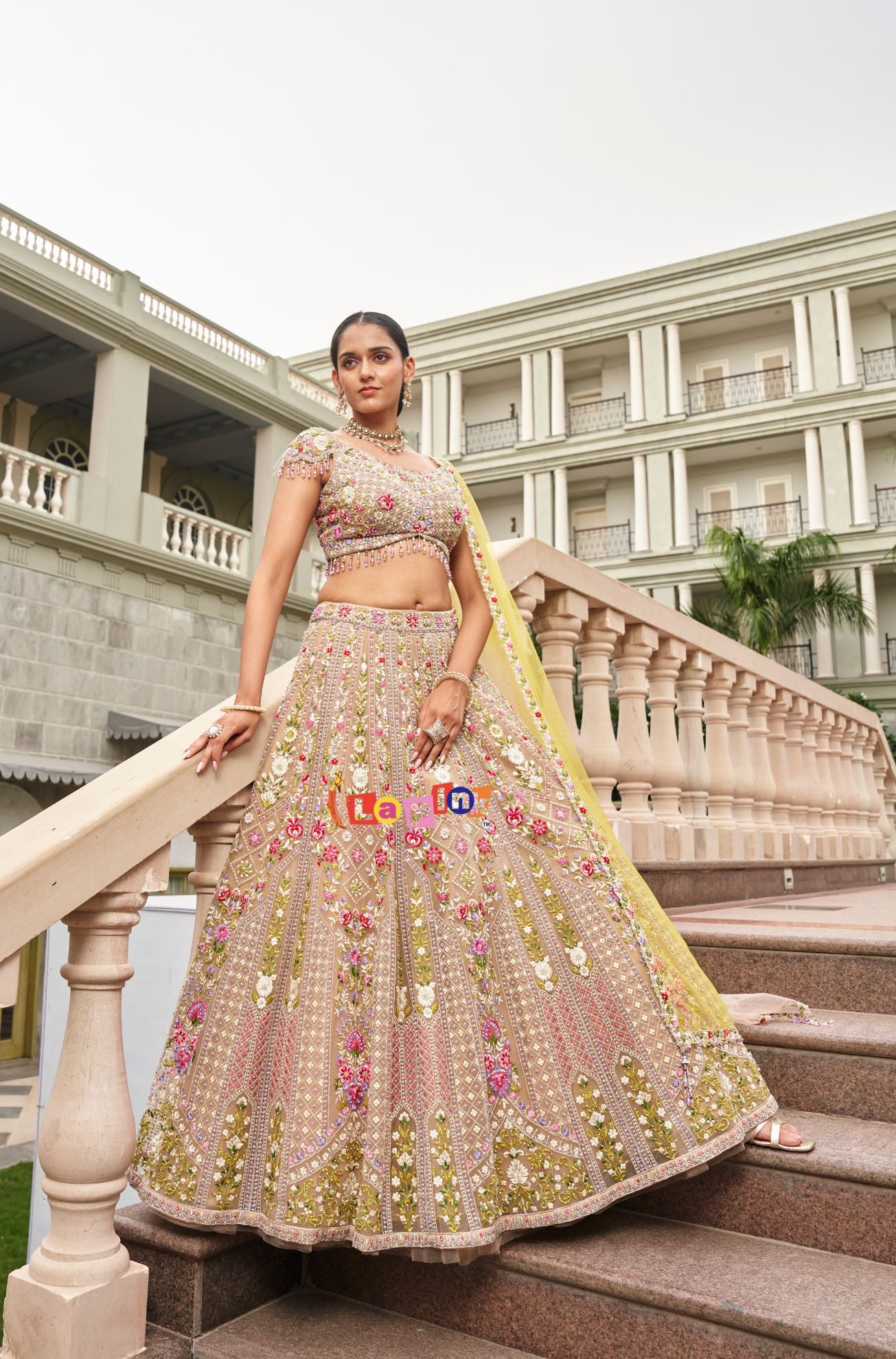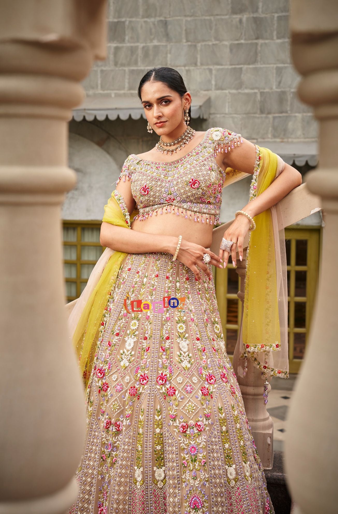 This lehenga set is crafted on net fabric and comes with detailed multi embroidery highlighted with stone work. The cream base is paired with a contrast net dupatta, adding definition to the overall look. The design combines traditional embroidery with a balanced finish, making it an appropriate outfit choice for parties, wedding functions, and festive occasions.