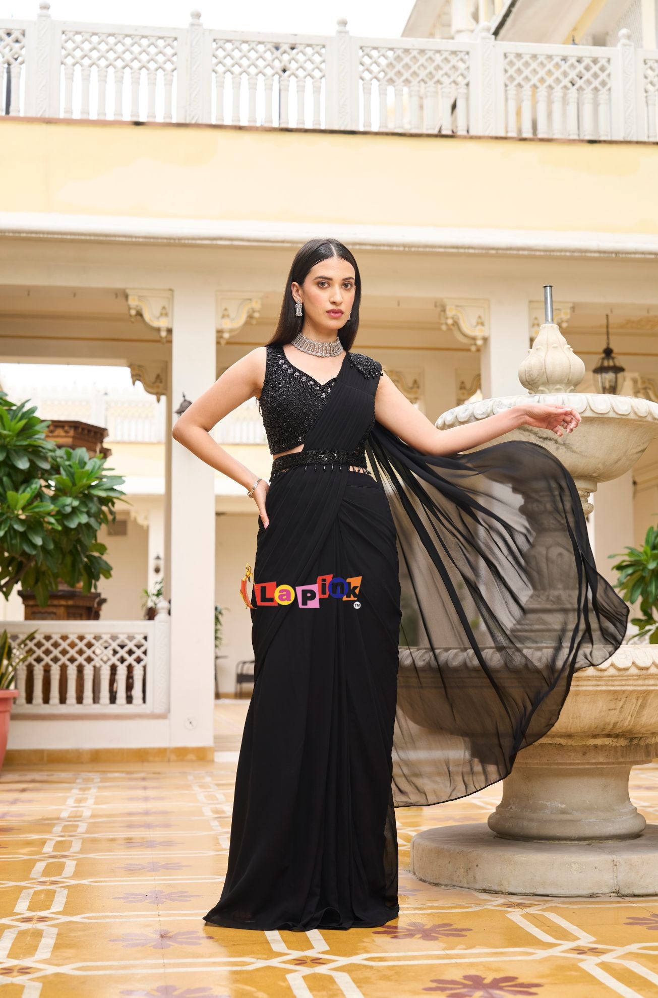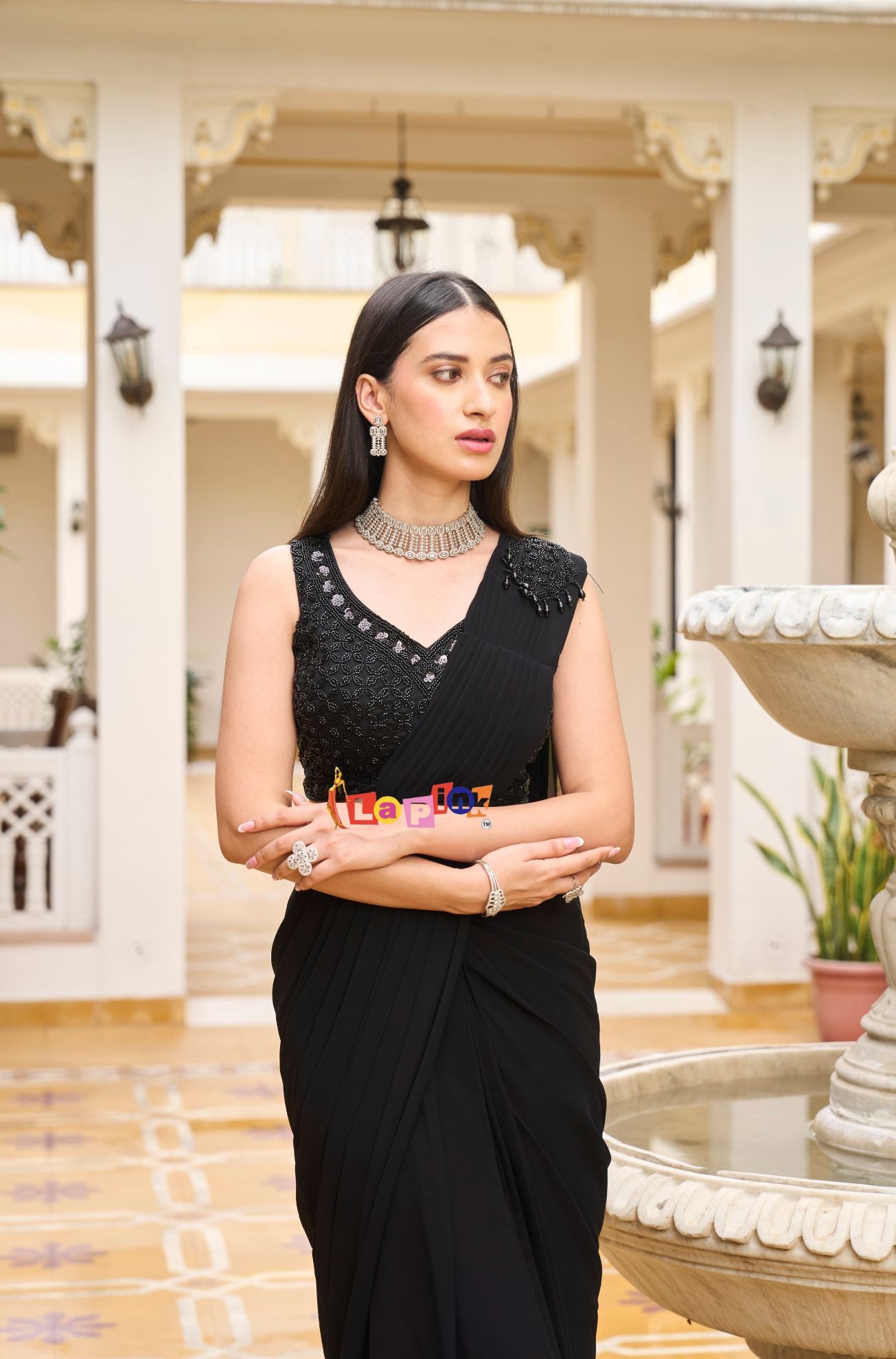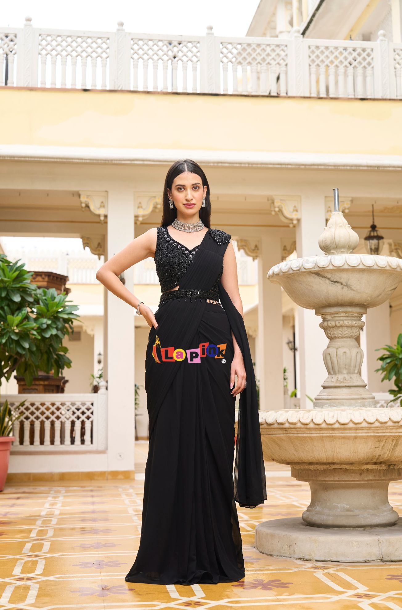 This pre-drape saree is crafted on net fabric with a viscose base, featuring detailed hand work with moti and sequence. Designed for both elegance and convenience, it offers a ready-to-wear draped style that is comfortable without compromising on style. The black colour adds a timeless touch, making it suitable for festive celebrations, weddings, and special occasions.