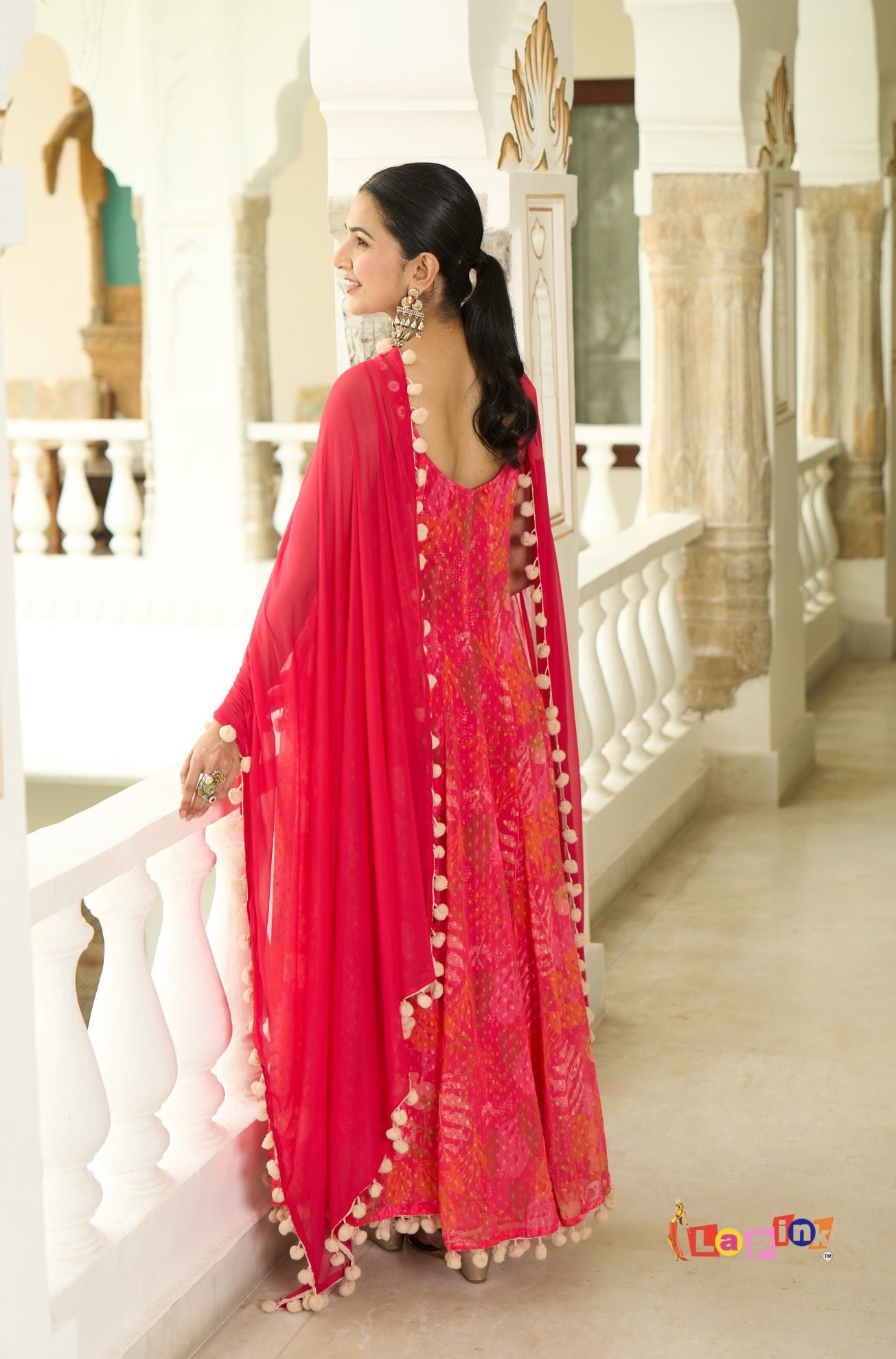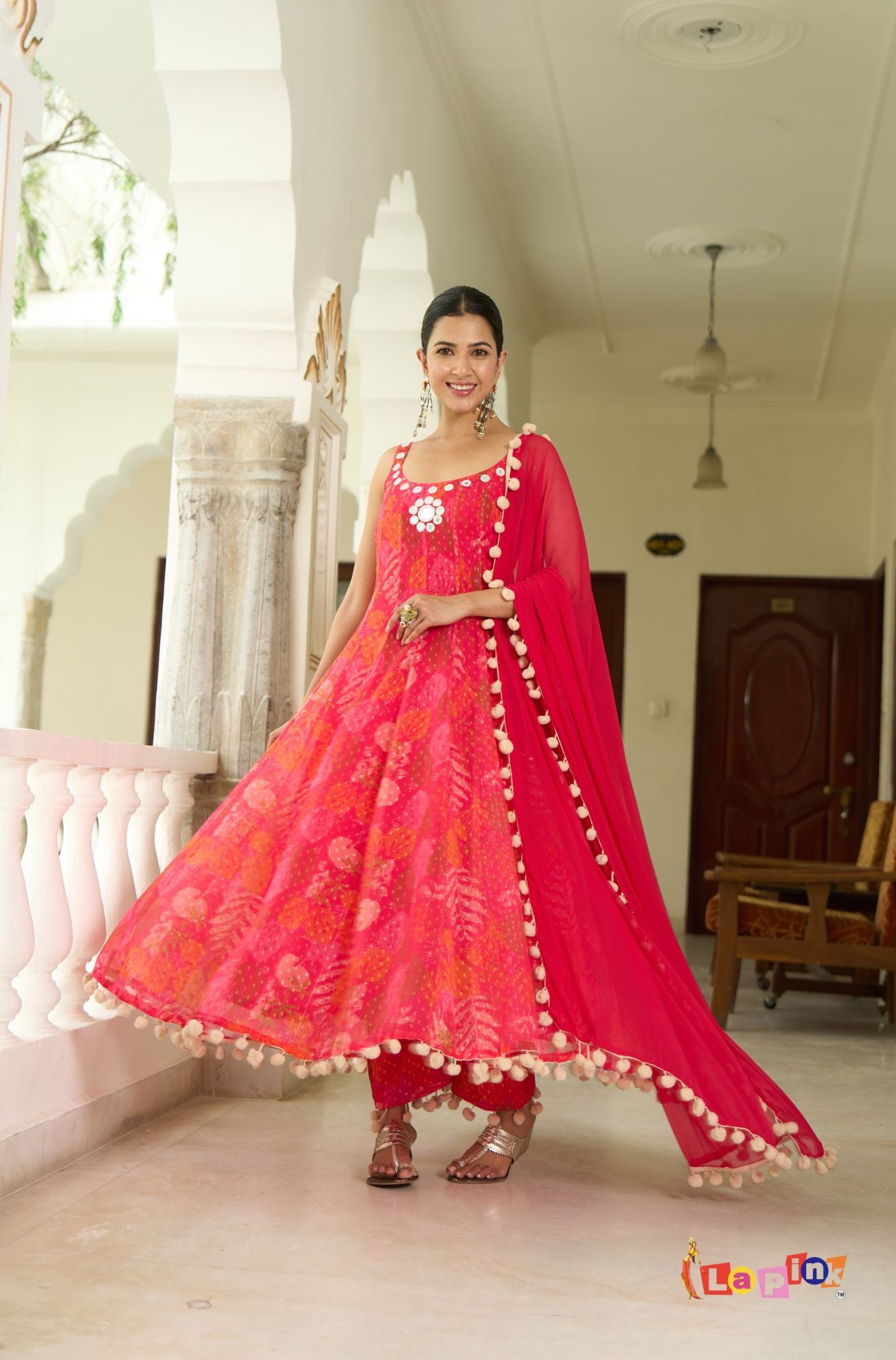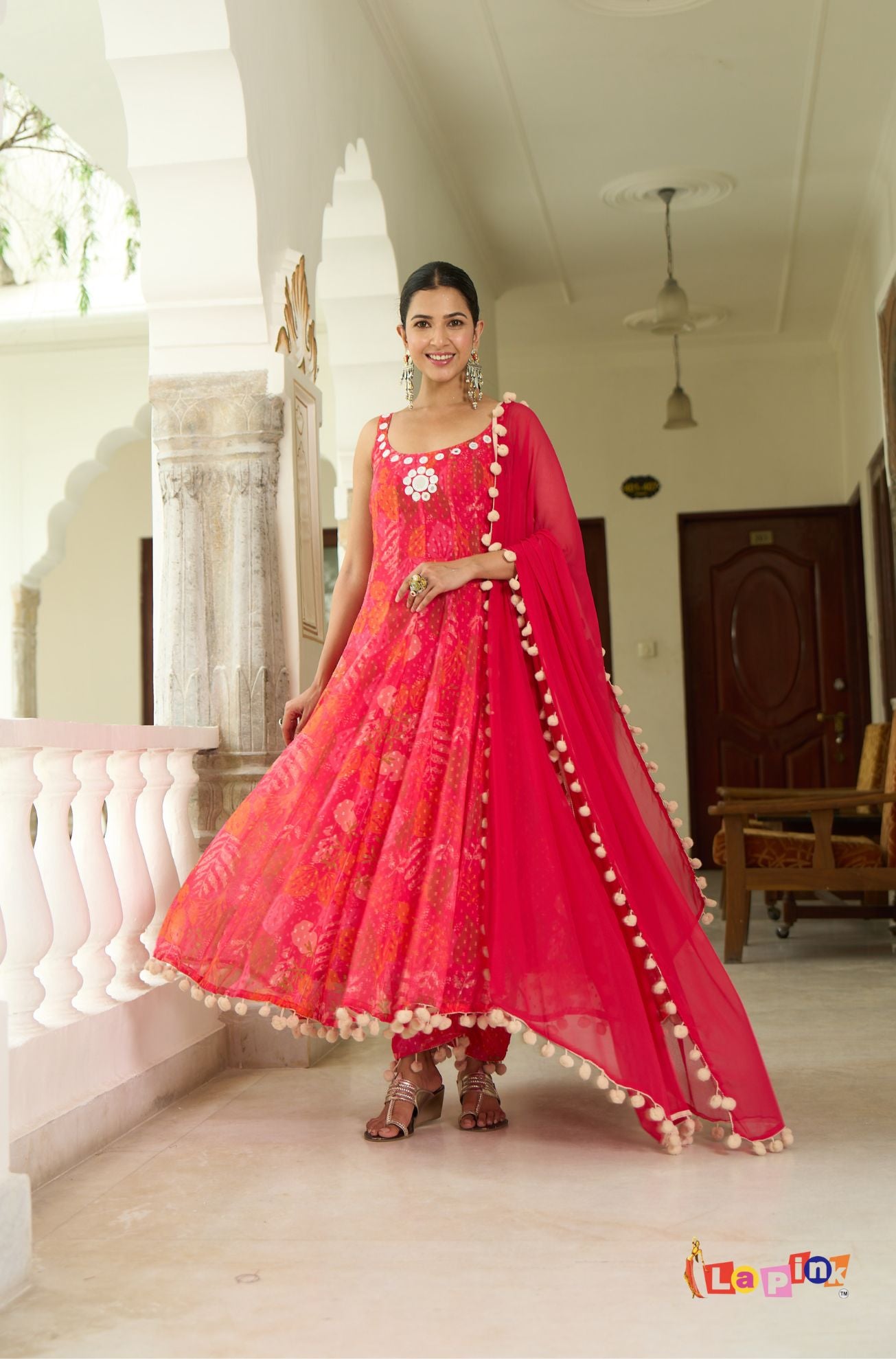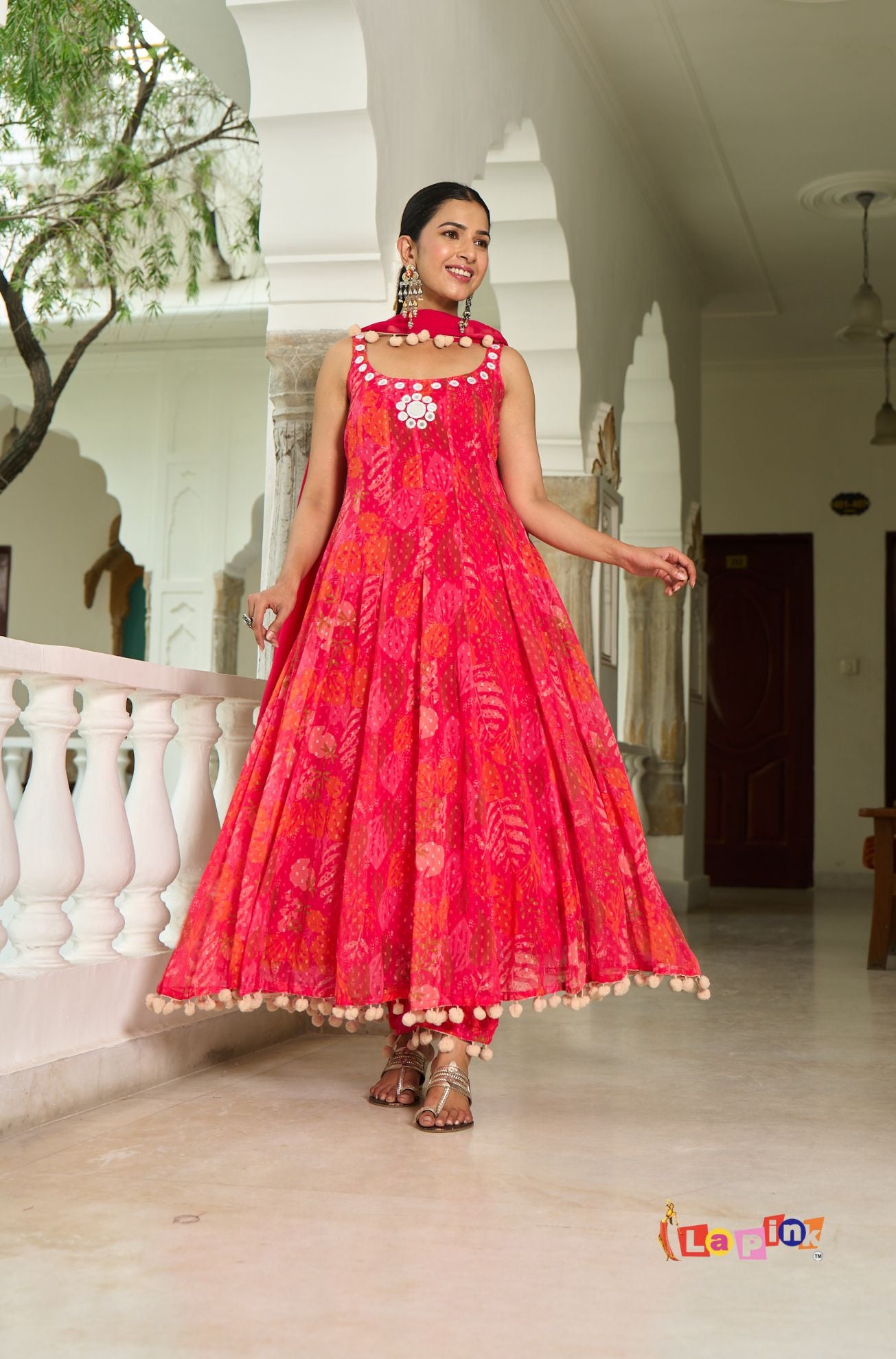 This outfit is designed on puff cotton fabric and features detailed thread work highlighted with mirror embellishments. The printed Anarkali is paired with matching pants and a complementing dupatta, making it a complete festive set. Available in red shades, it offers a vibrant yet graceful look, ideal for special occasions.