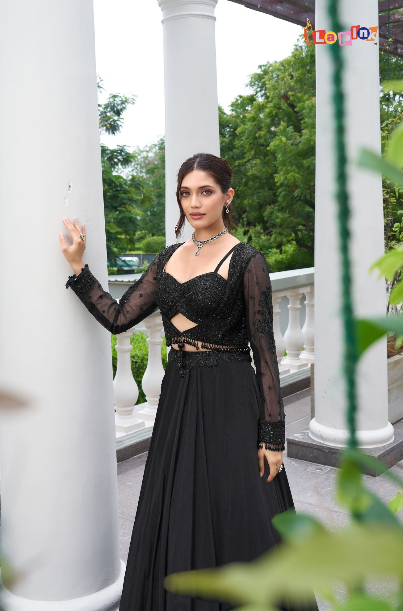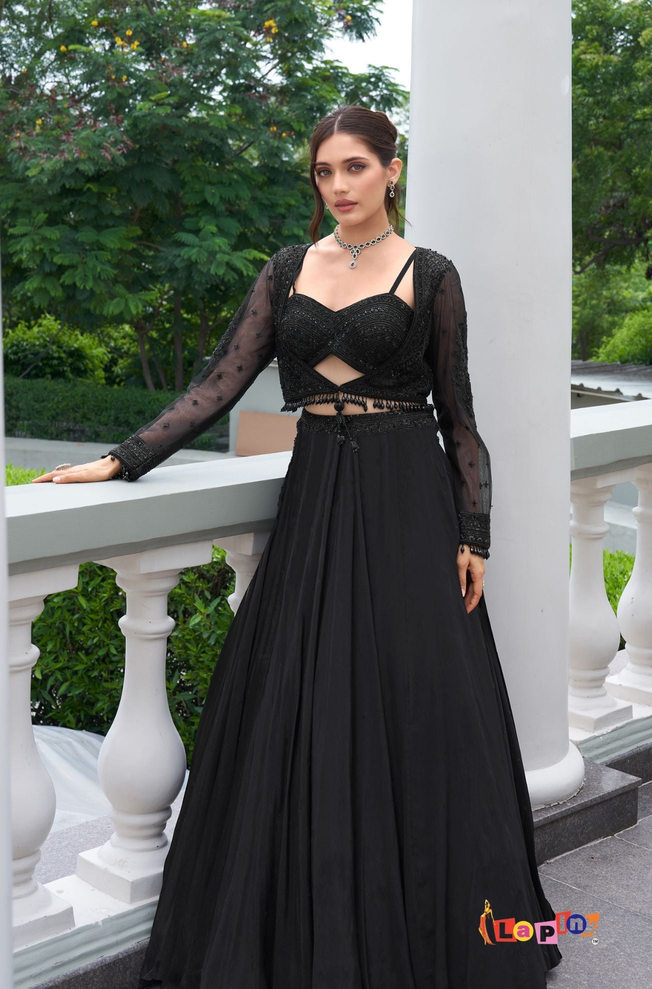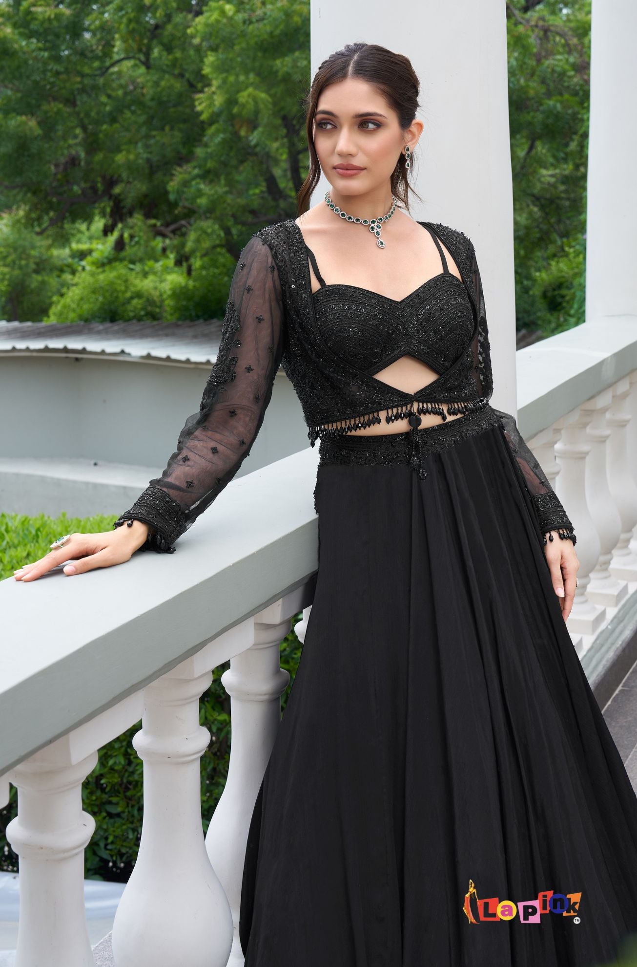 This lehenga set is made from soft viscose fabric and features detailed handwork with sequins and piping that adds fine finishing to the outfit. The set is paired with a full-sleeve jacket, giving it a structured appearance while adding extra coverage and style. The deep black color makes it a versatile option that can be worn for various festive and formal occasions. Designed to balance comfort and style, this outfit is a suitable choice for those looking for a classic yet detailed ensemble.