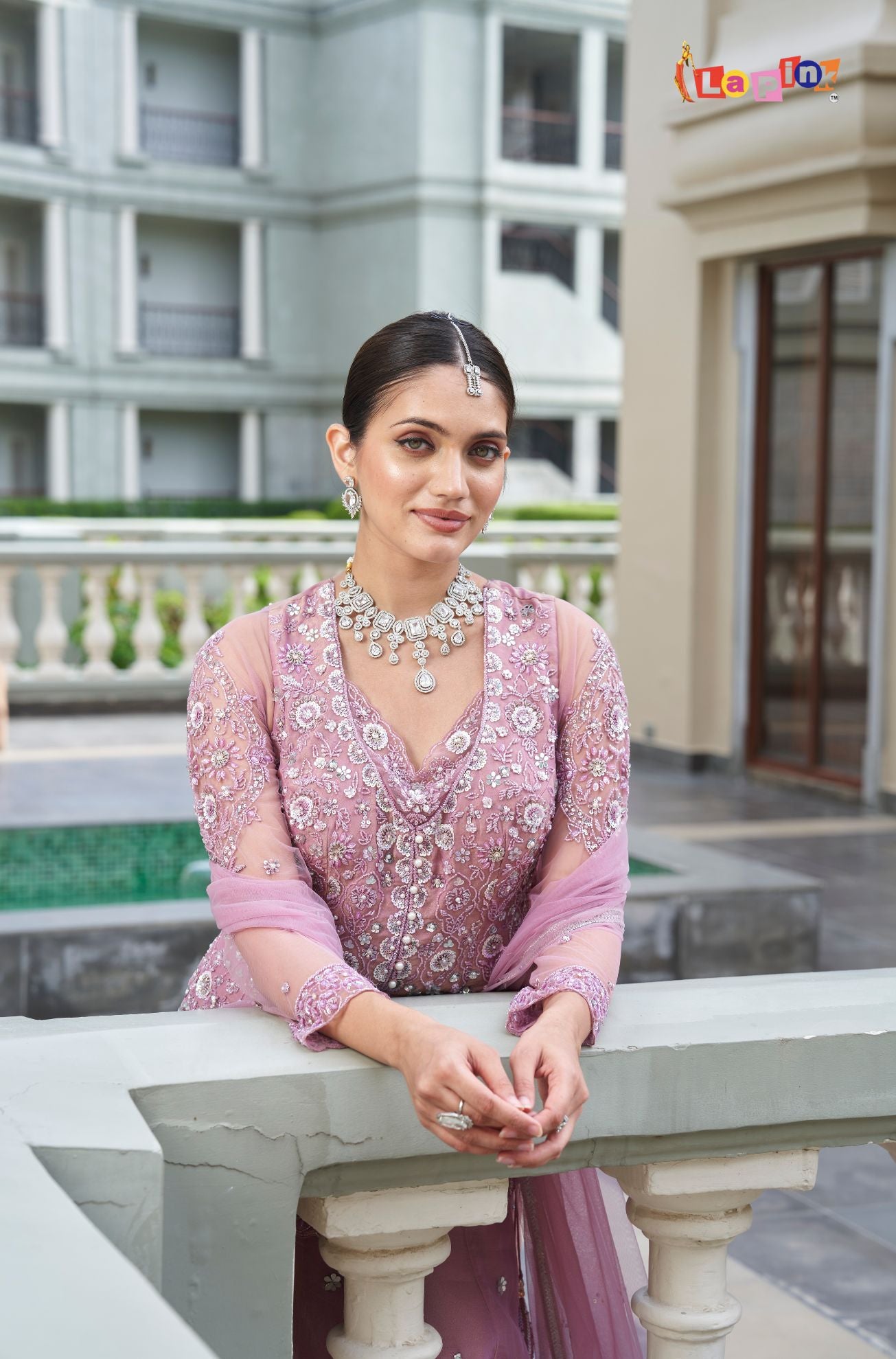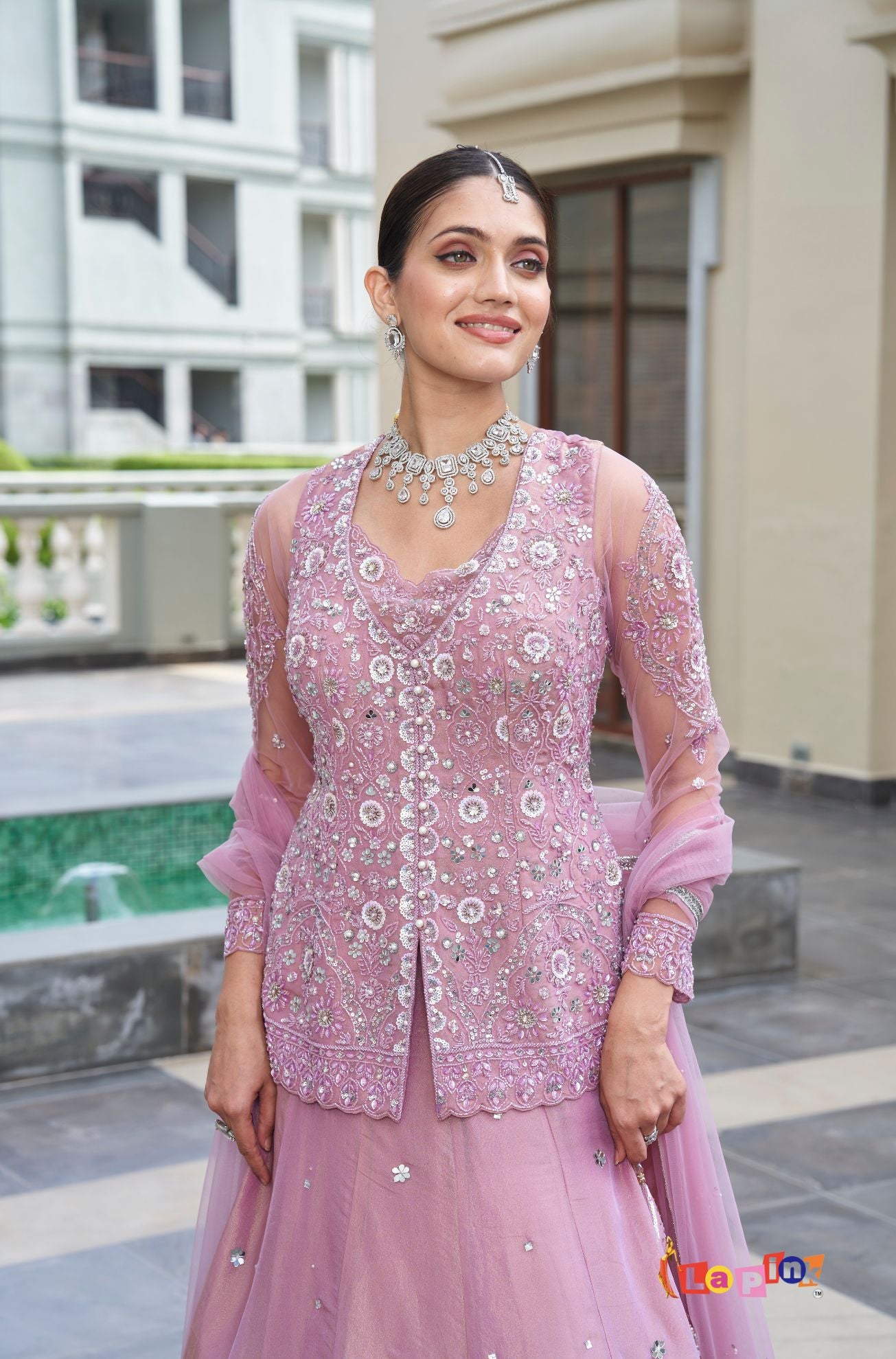This designer set is crafted on shimmer fabric and features detailed handwork enhanced with piping and sequin accents. The front-cut peplum top adds a structured and elegant look, paired with a matching skirt that maintains a balanced silhouette. The net dupatta complements the overall design with its lightweight and coordinated finish. This outfit works well for festive functions, wedding events and parties where a neatly detailed and comfortable ensemble is required.