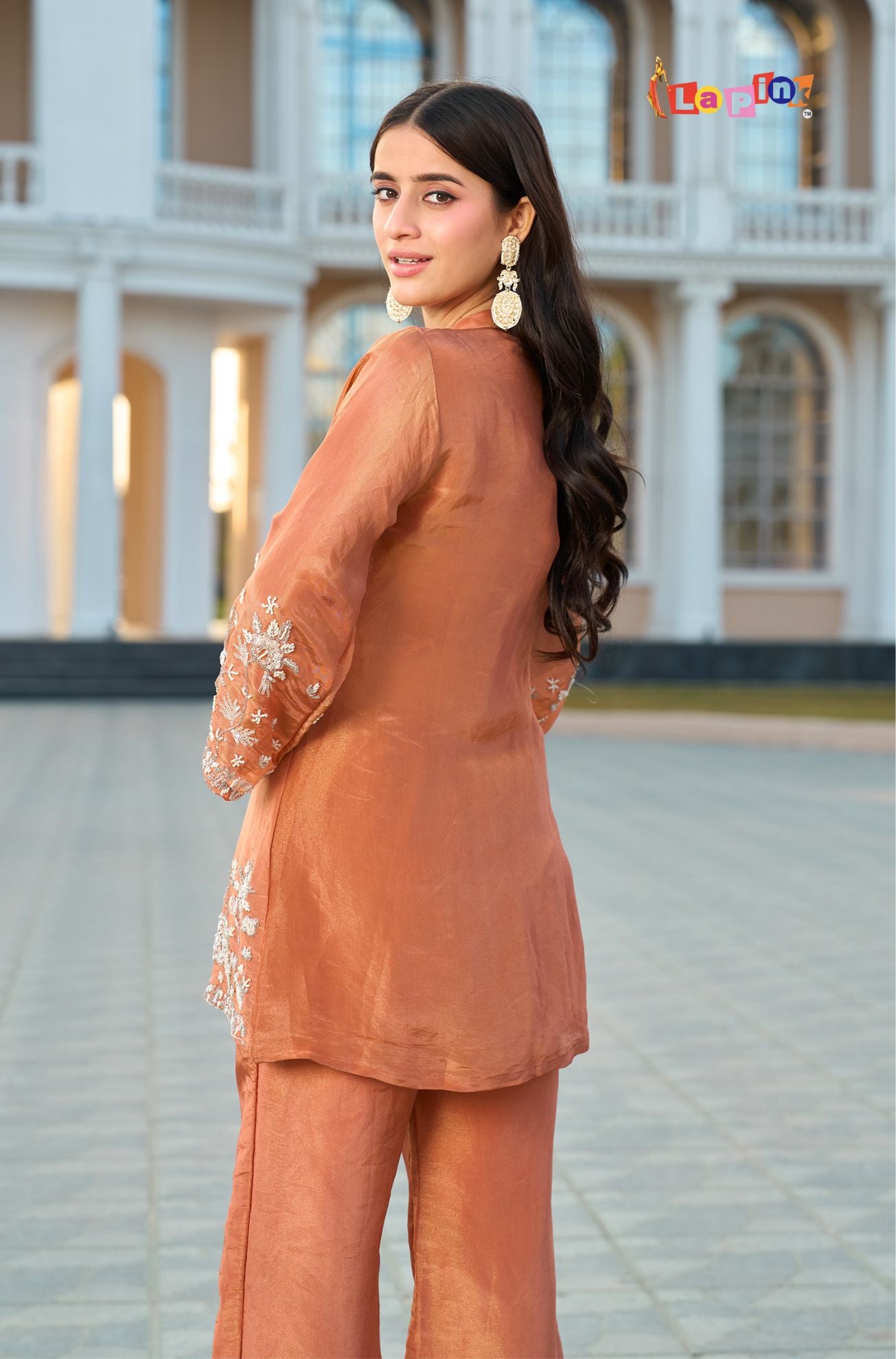 This three-piece set is made from shimmar fabric and detailed with beats work spread evenly across the outfit, giving it a clean and structured look. The straight collar design adds a sharp finish, while the coordinated pieces come together for a balanced and comfortable fit. Suitable for festive wear and special occasions, this set is designed to be easy to carry for longer hours while maintaining a well-finished and presentable appearance.