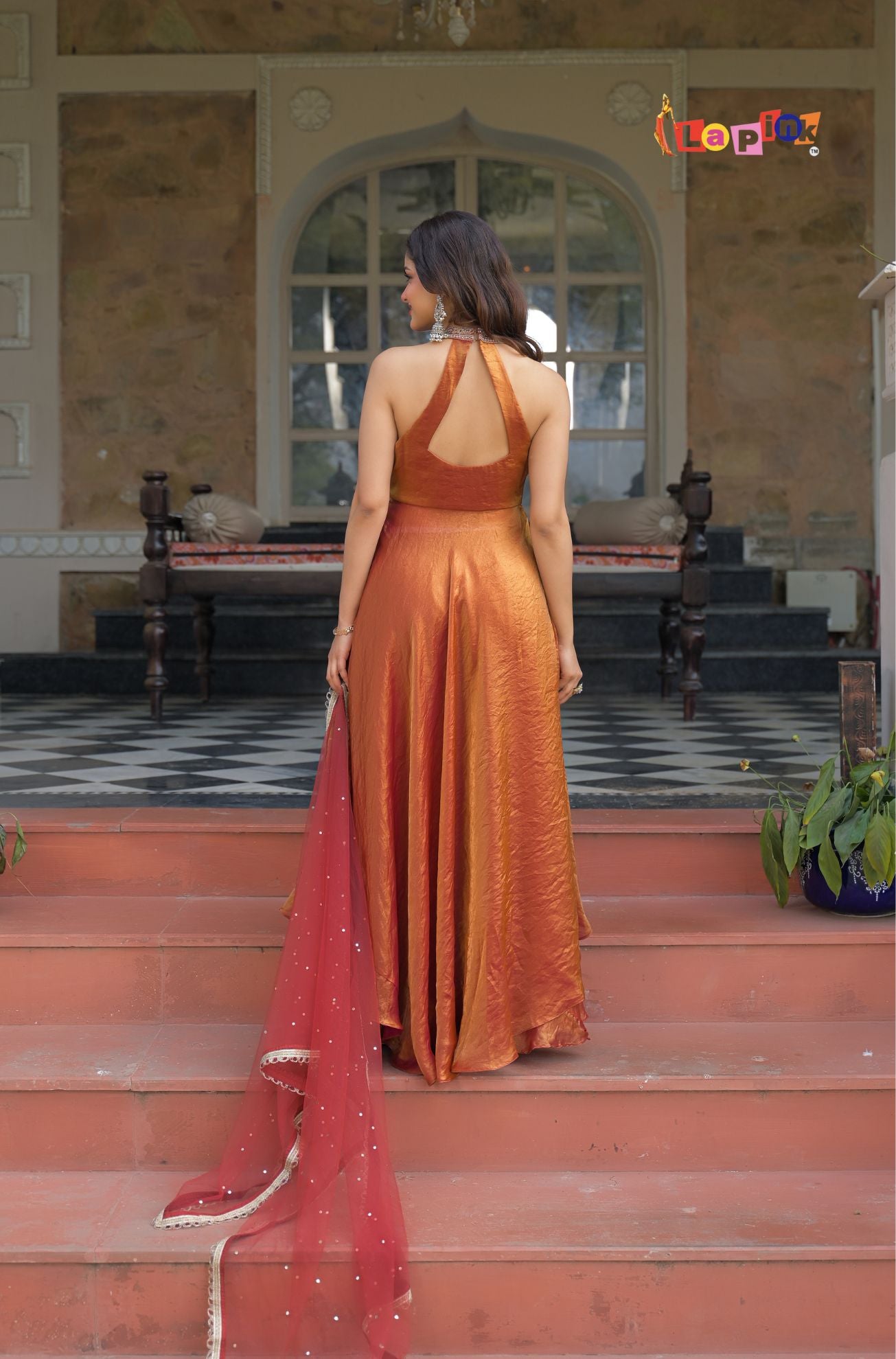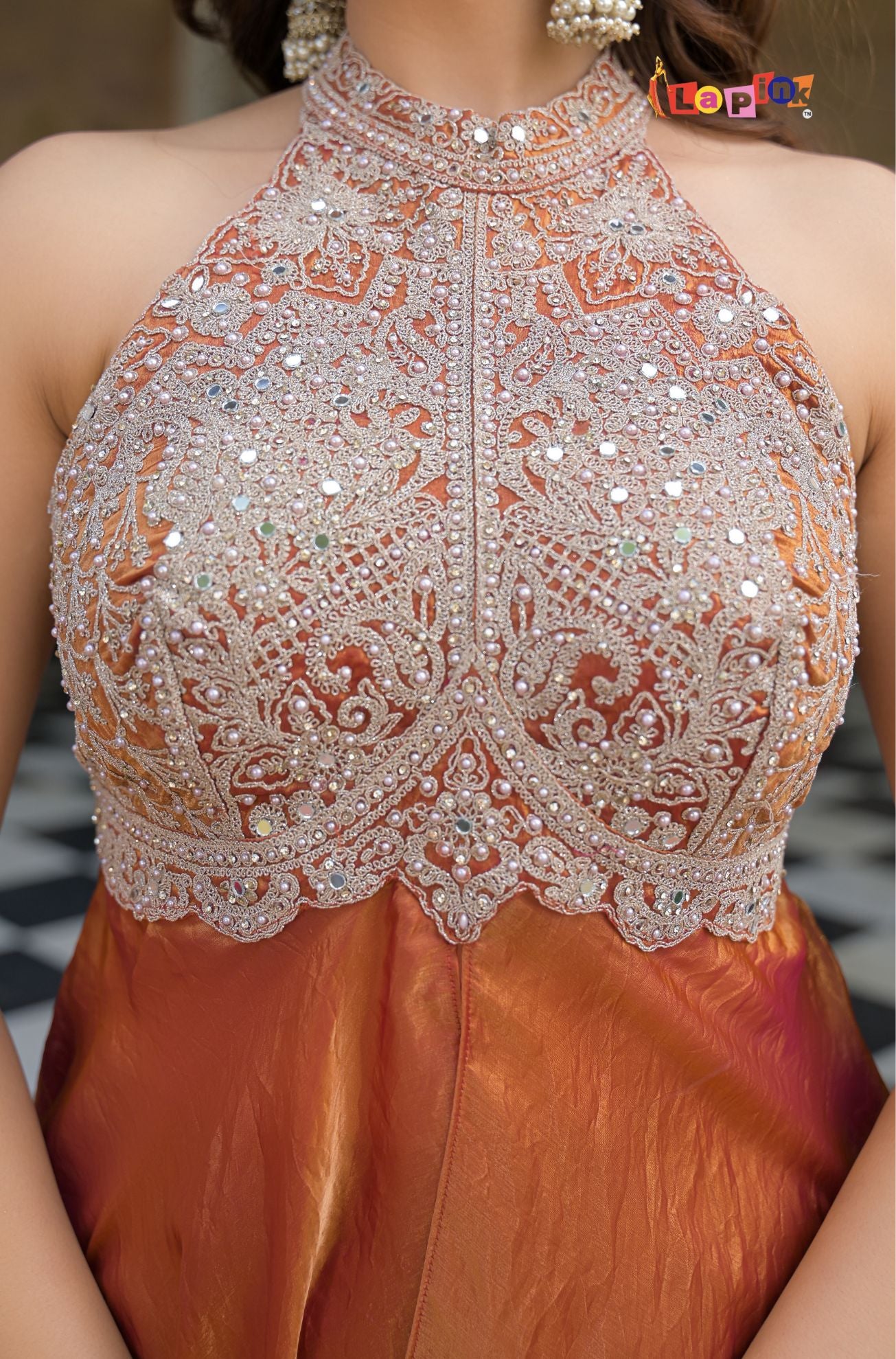 This designer round neck front cut plazzo set is made on smooth Fendi fabric and detailed with stone embroidery that adds a clean and refined look. The front cut kurta gives a flattering silhouette, while the plazzo offers comfort and ease of movement. Paired with a matching dupatta, this three-piece set works well for festive occasions and small celebrations where you want a balanced mix of style and comfort.