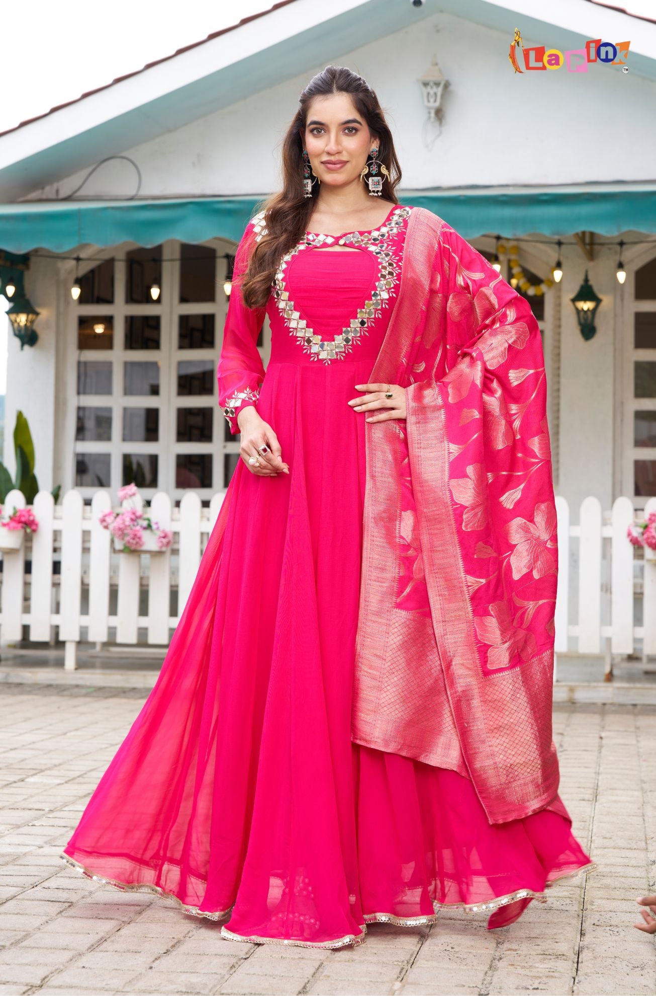 Thread and Mirror Work Anarkali with Jacquard Dupatta