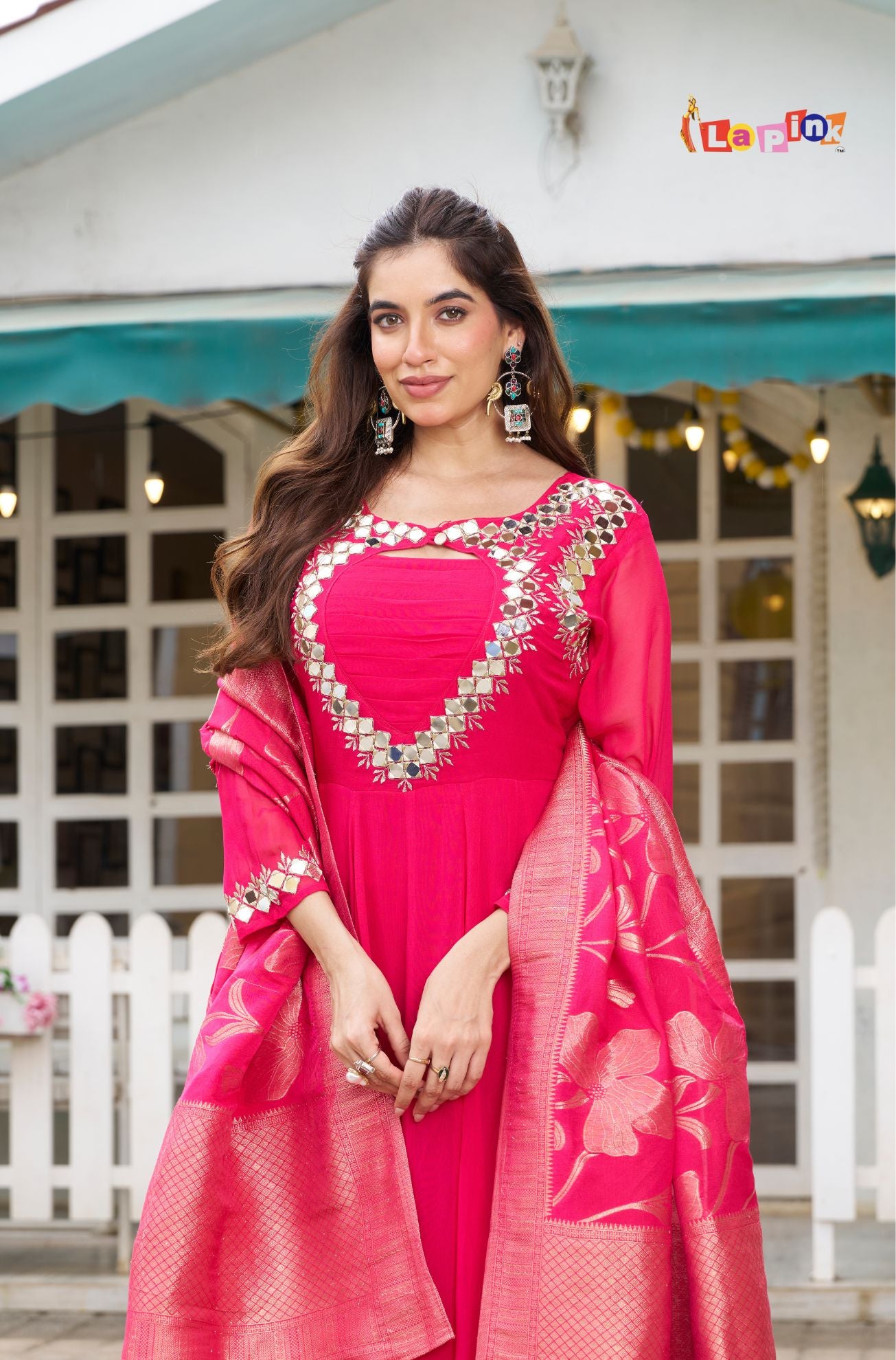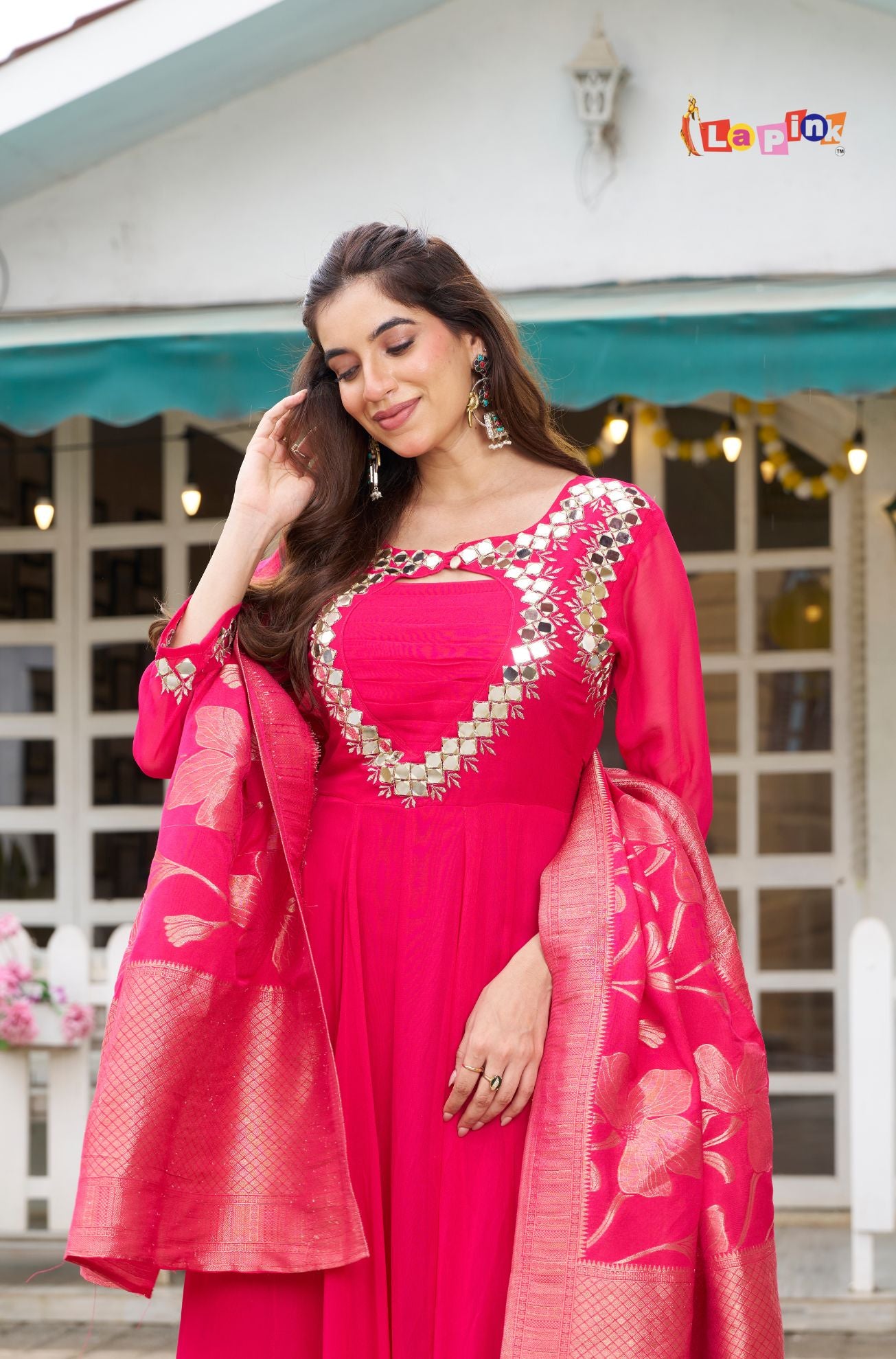 This outfit features a designer Anarkali crafted from viscose fabric, offering a comfortable and structured drape. The Anarkali is detailed with thread and mirror work that adds a refined look suitable for festive and traditional occasions. It is paired with a jacquard dupatta that complements the outfit with its textured finish. The two piece set in a rich Rani shade is ideal for family gatherings, festive events, and cultural celebrations.